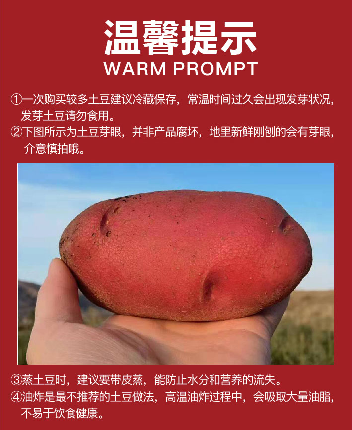 每一个红皮大土豆来之不易,我们坚持新鲜现挖,产地直发,不卖库存果!从田间到餐桌,从农民的双手到你的手中,新鲜品质看得见!