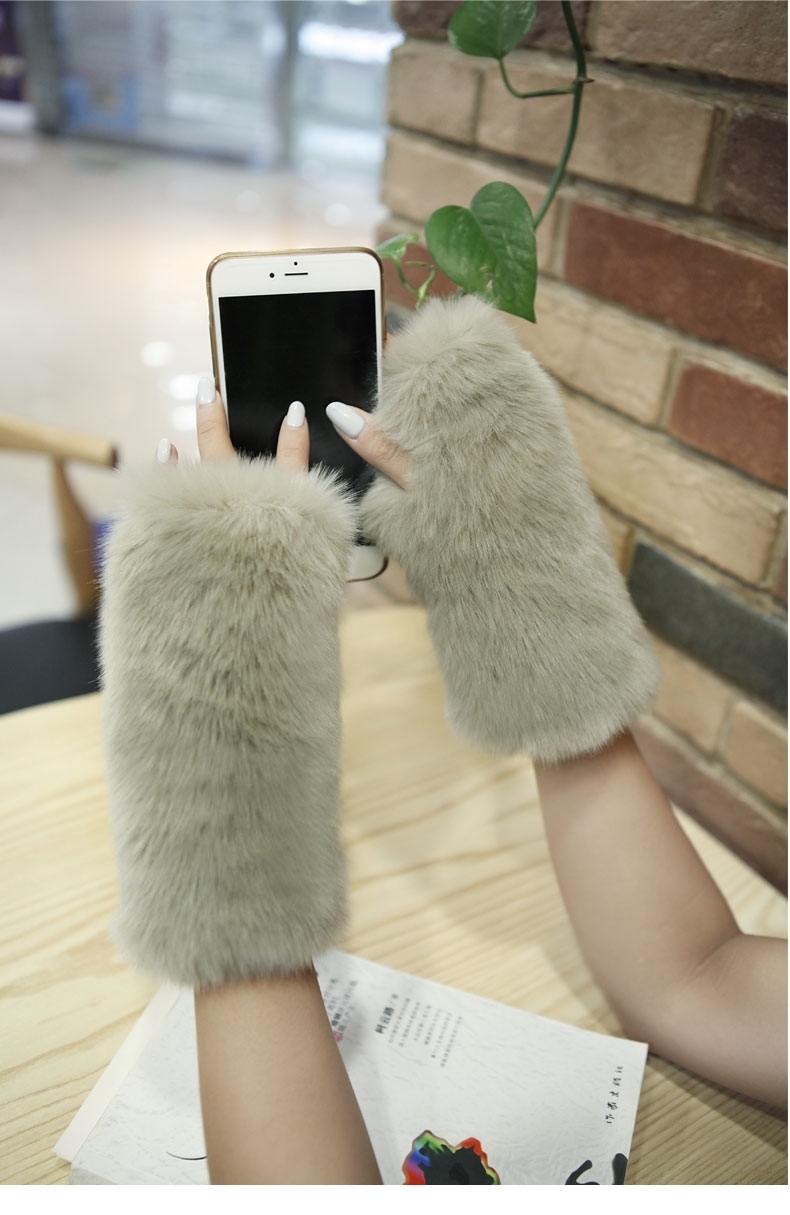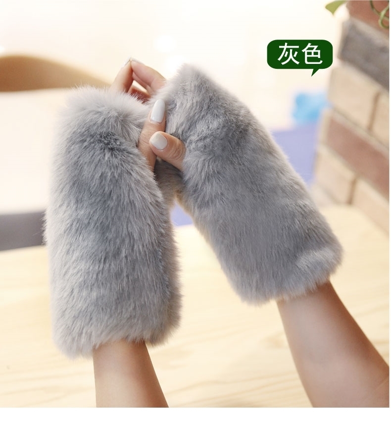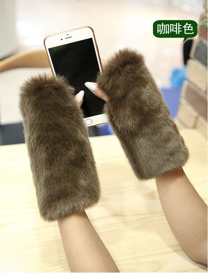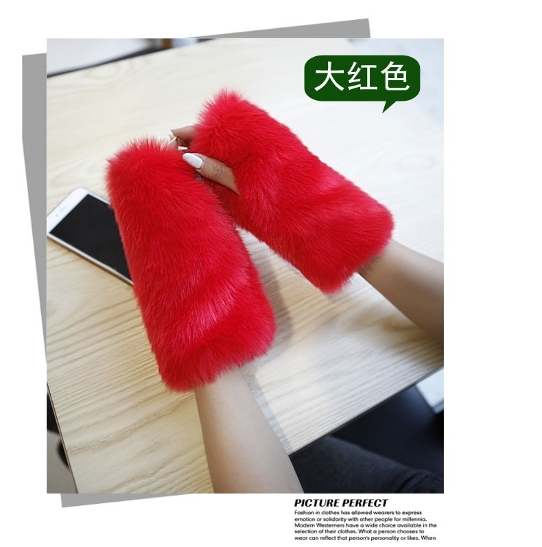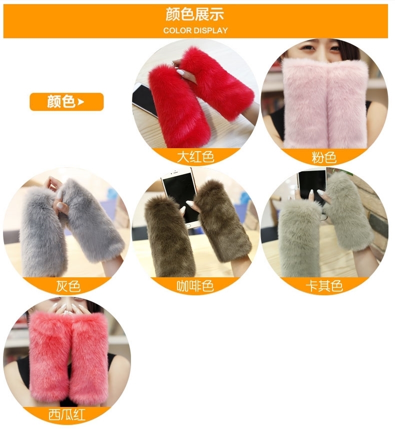 秋冬保暖女士半指露指手套 仿兔毛毛手套可爱 长袖口护手套