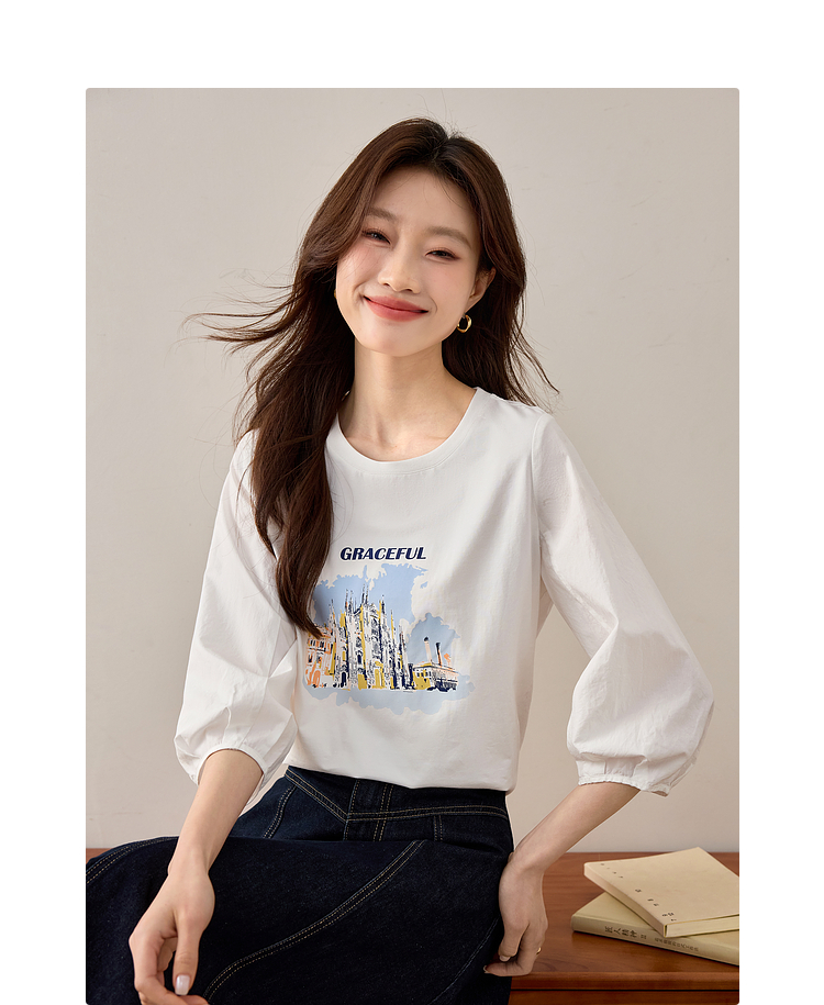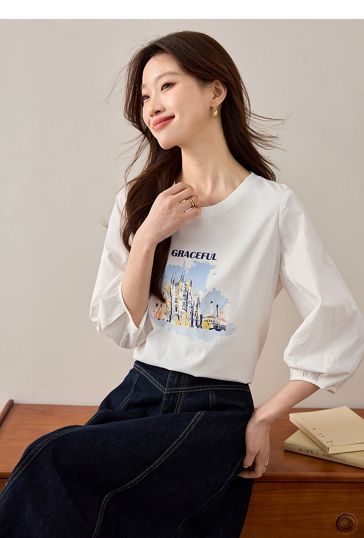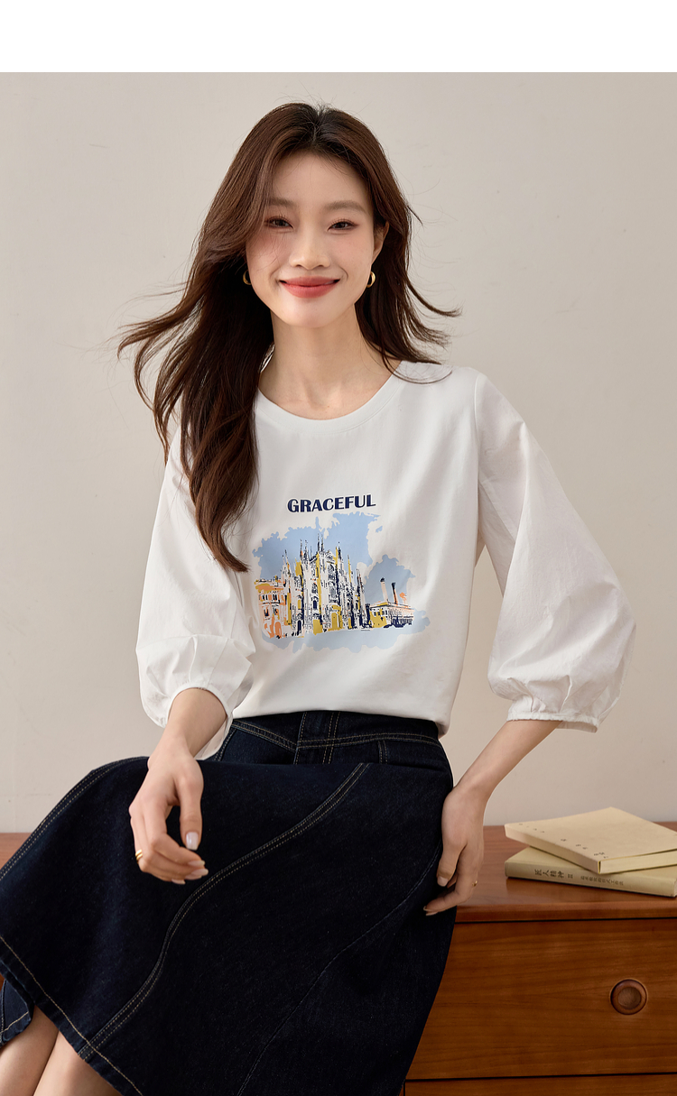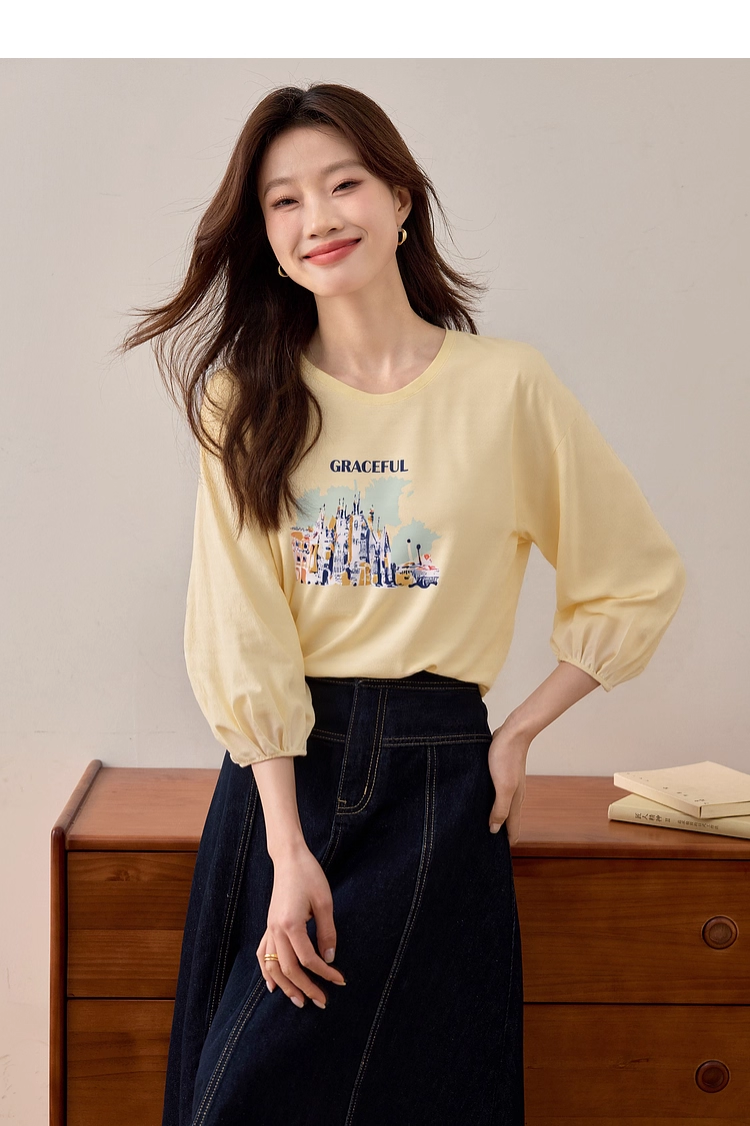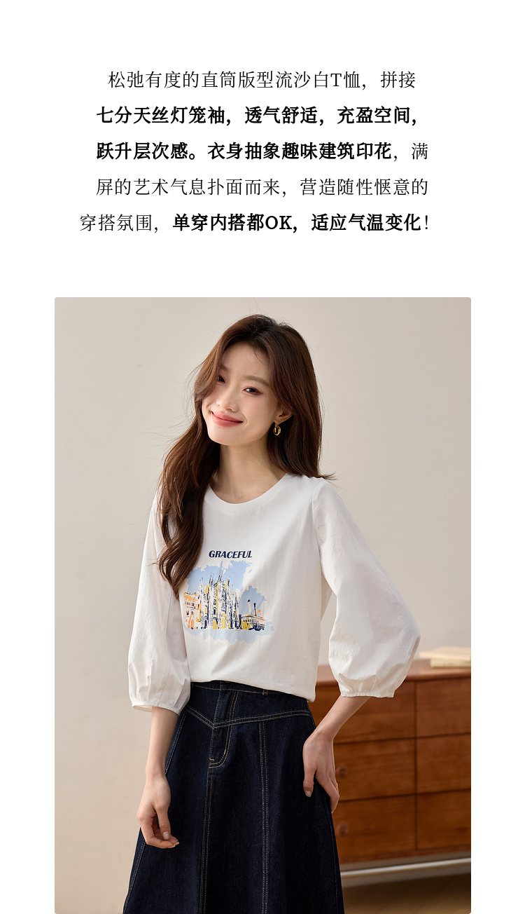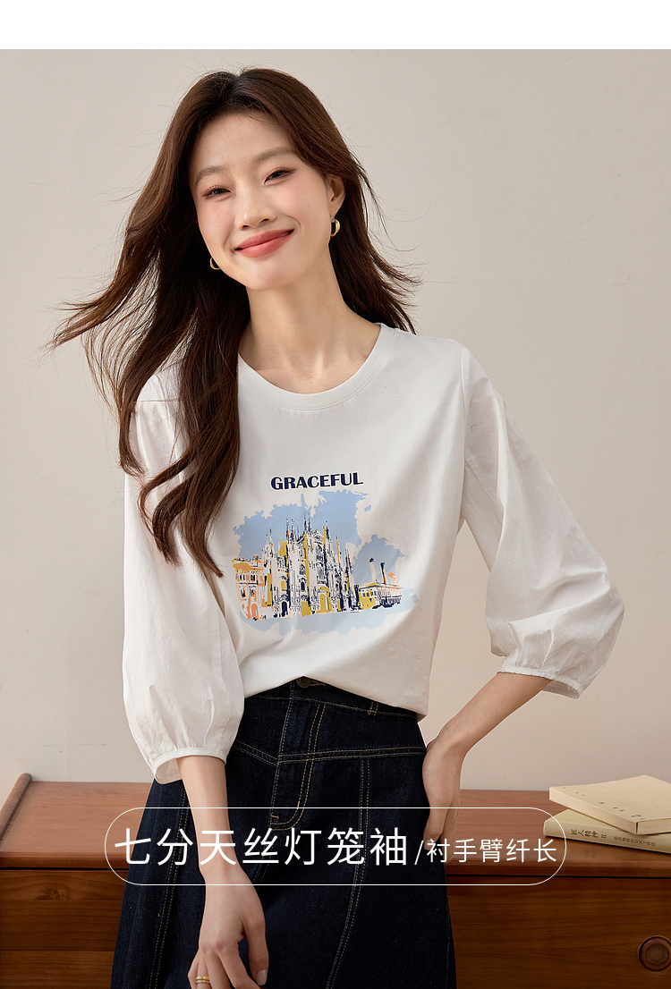 【年终特卖】熙世界灯笼七分袖印花T恤女春2025新款时尚减龄中袖天丝体恤上衣