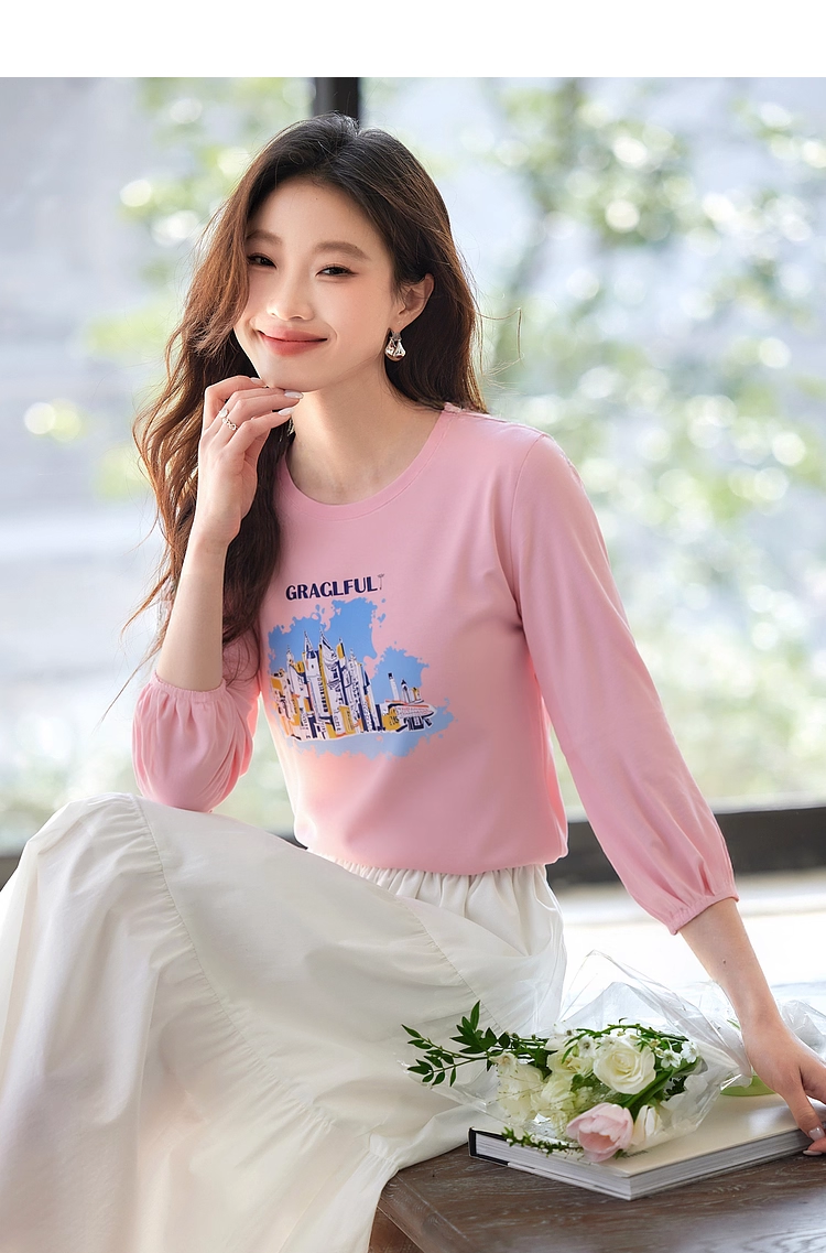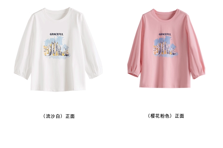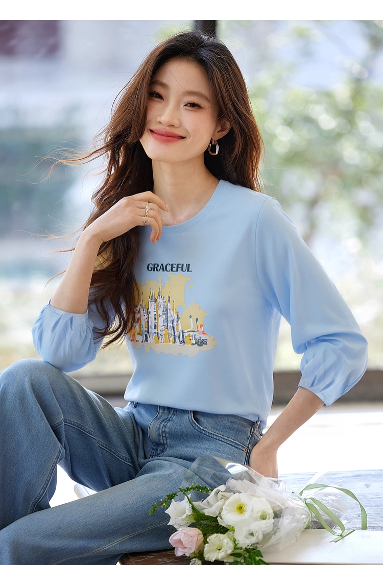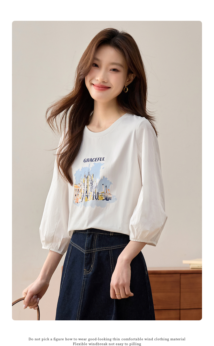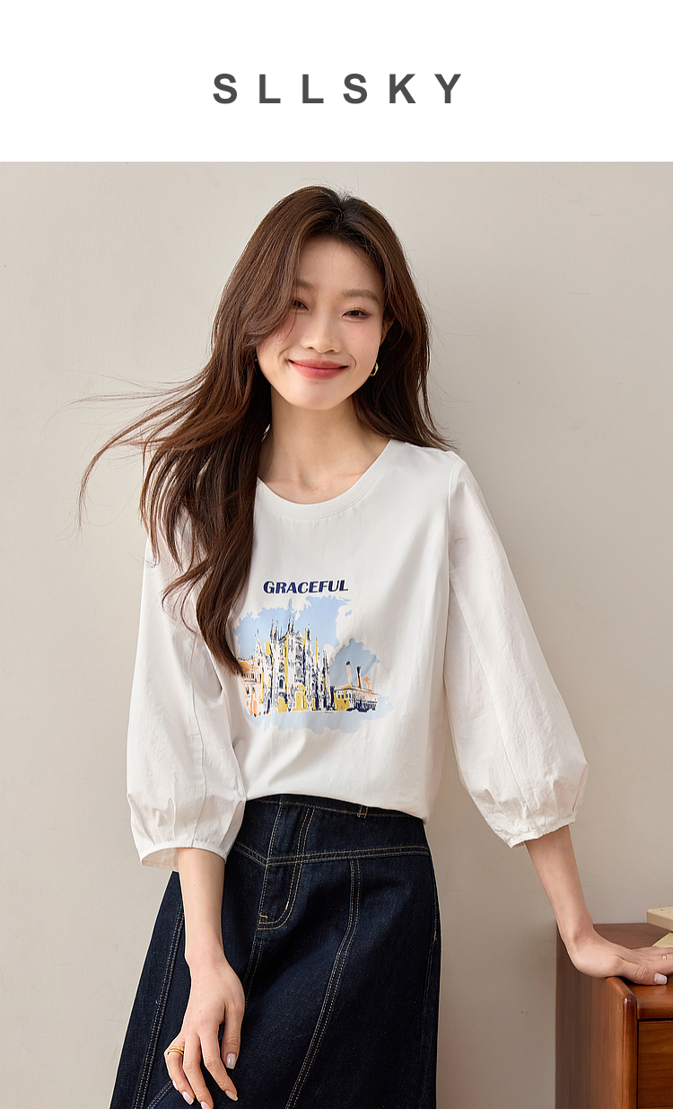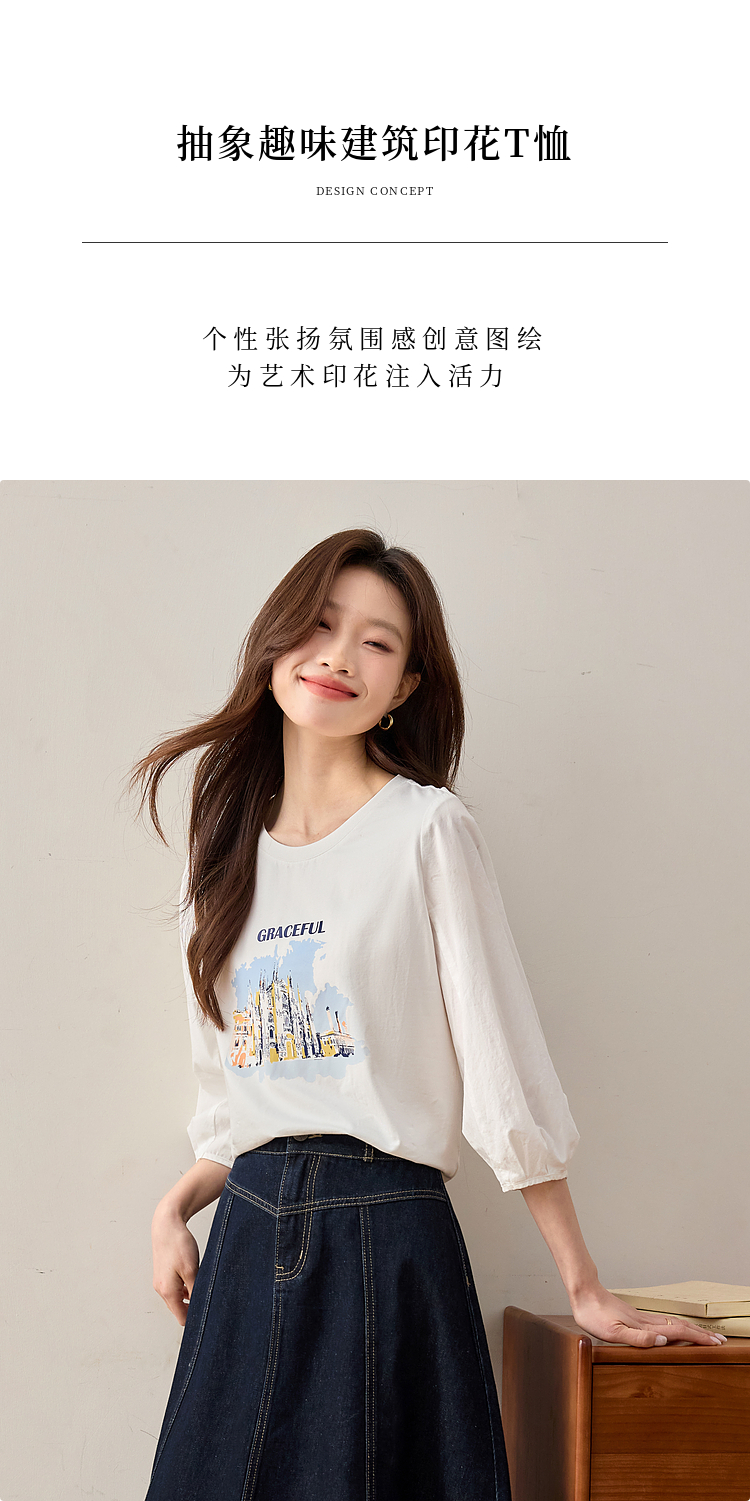 【年终特卖】熙世界灯笼七分袖印花T恤女春2025新款时尚减龄中袖天丝体恤上衣