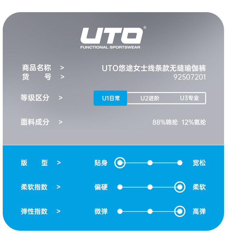 UTO悠途潜心于贴身运动装备的研发、设计和生产。从纤维到组织,从设计到工艺,在无缝贴身运动装备领域,树立国内标杆。 UTO着力于品牌互联网化,不断采集大量运动数据,为跑步、健身、滑雪等不同类型的运动爱