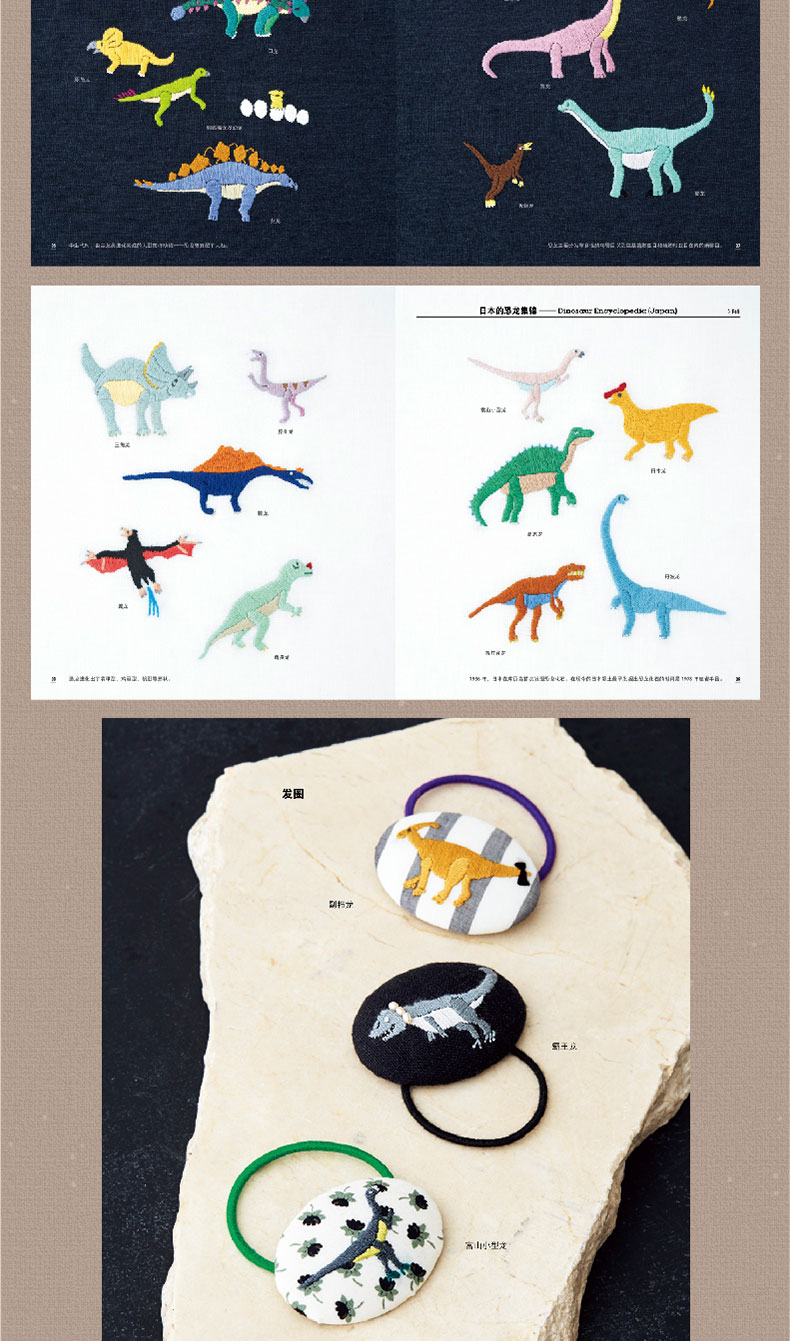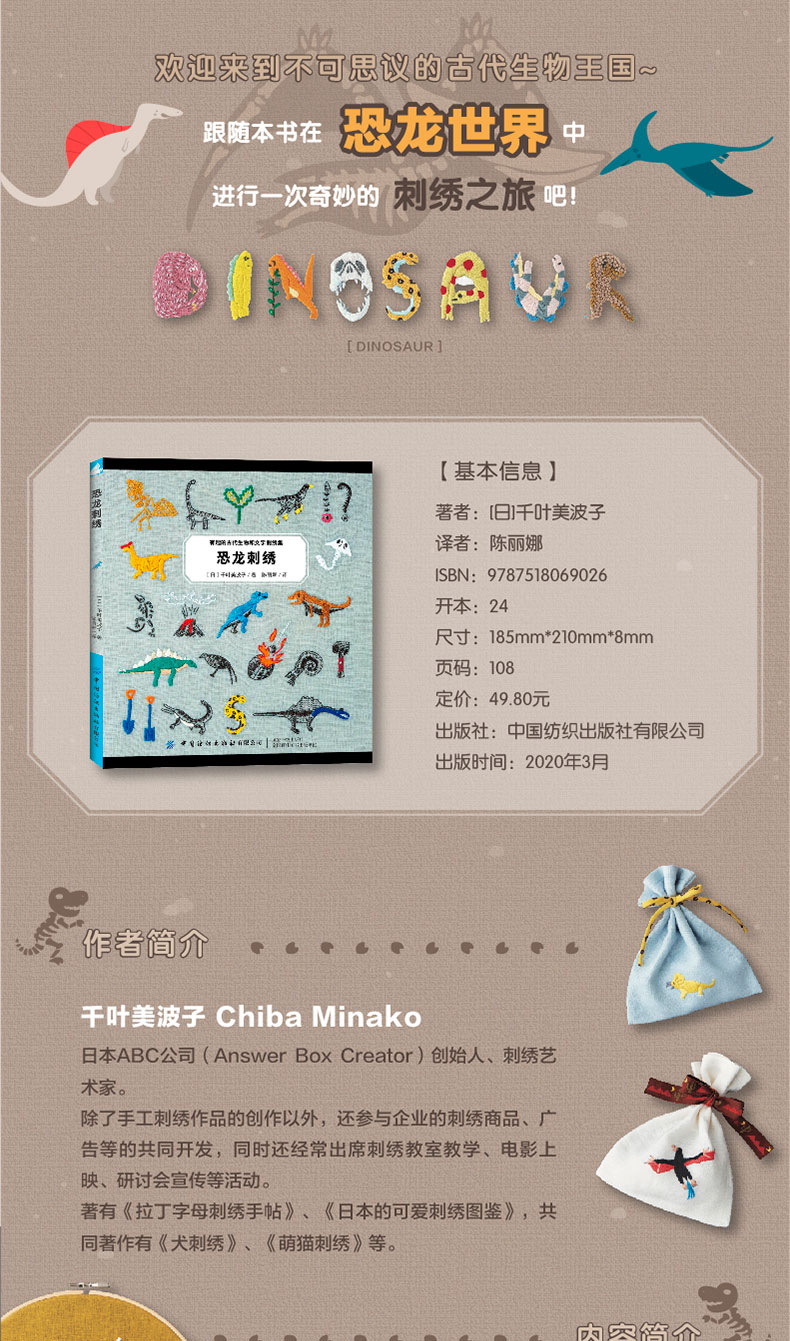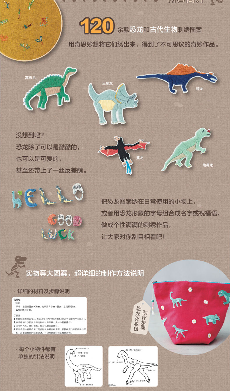 2020新书 恐龙刺绣 千叶美波子 可爱动物植物萌物手作刺绣编织手工DIY设计制作入门教程书 狗狗猫咪胸针装饰工具步骤详讲 钩针编织