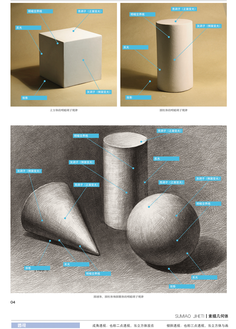 《素描几何体》从简单的单体石膏几何体到略微复杂的石膏几何体组合,逐步深入,内容基础。