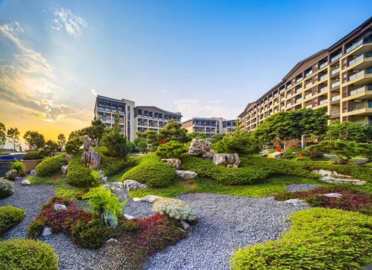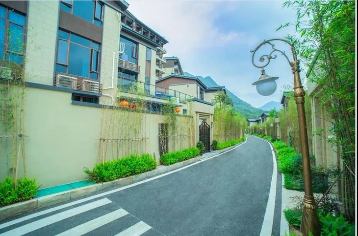 别墅依山而建,街道两旁皆种满了郁郁葱葱的刚竹和排骨草。缓步间踏入别墅的门口,引入眼帘的就是一个两层高的中式庭院。