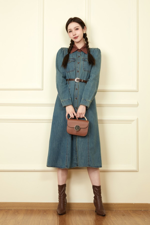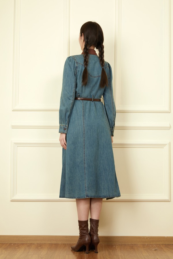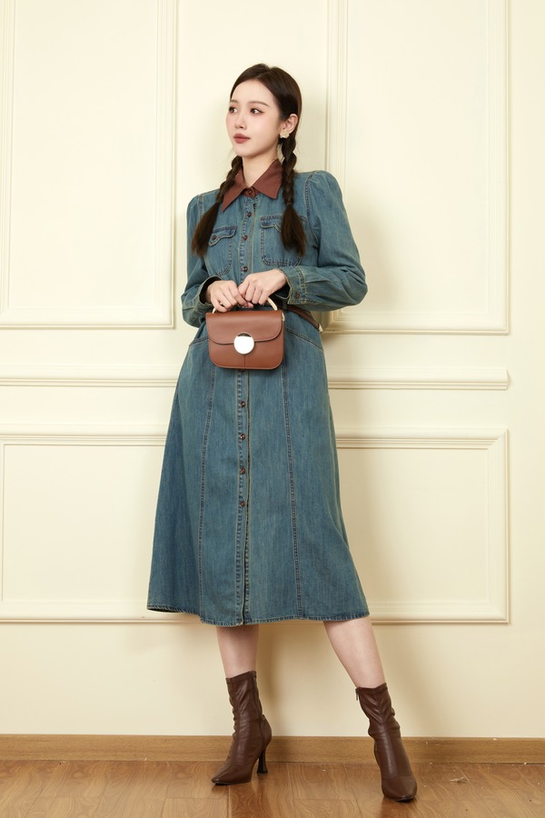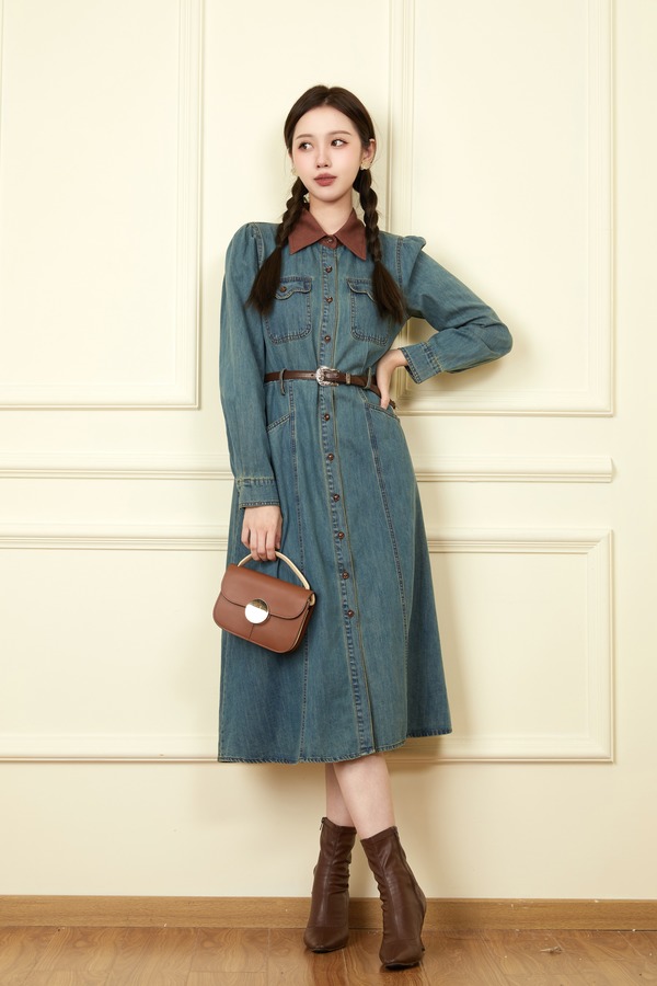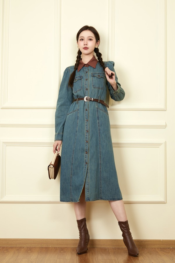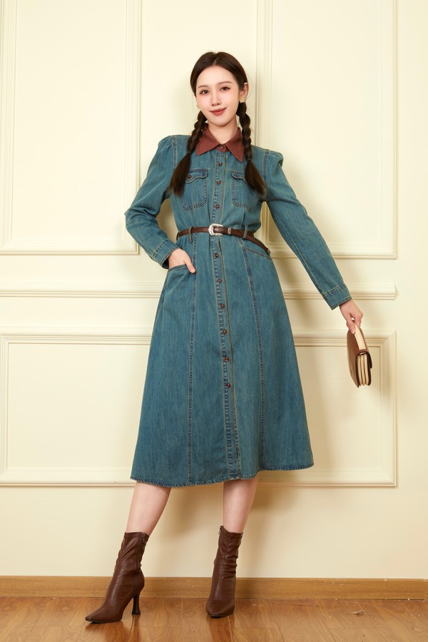 L.Fleuri 撞色拼接翻领牛仔连衣裙 18646