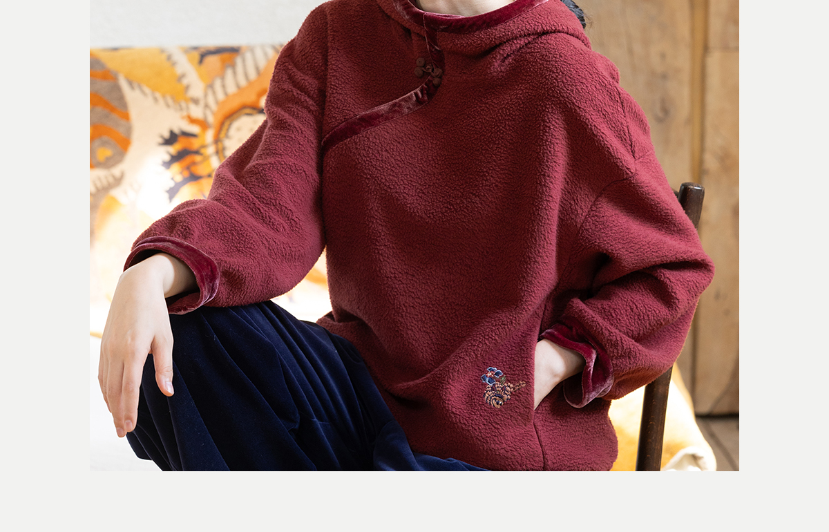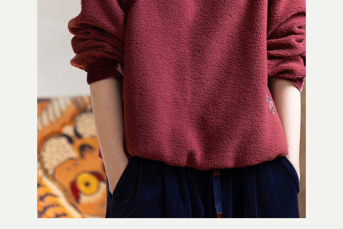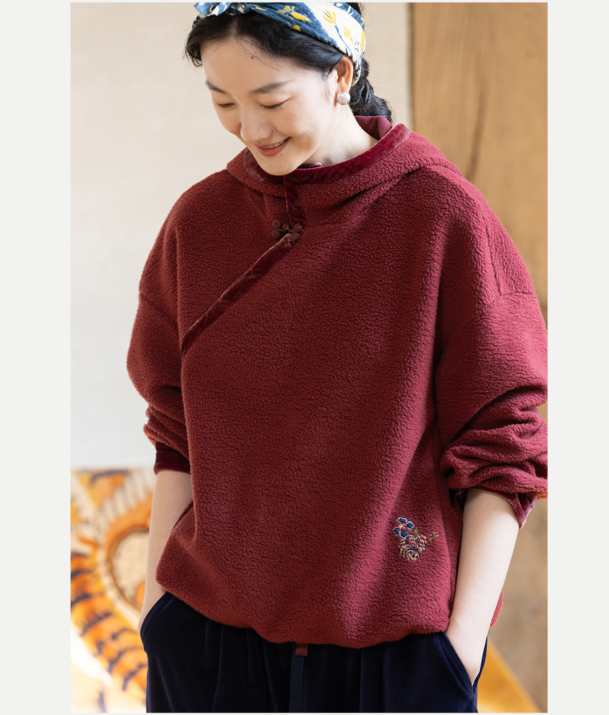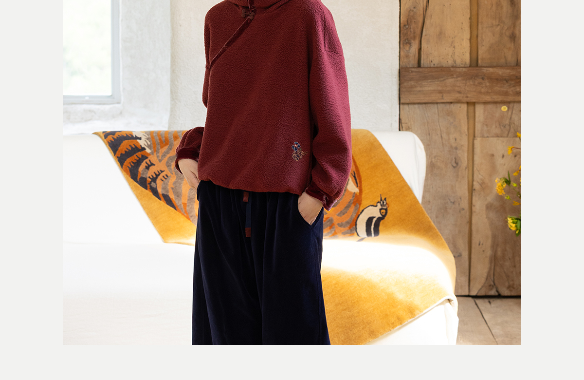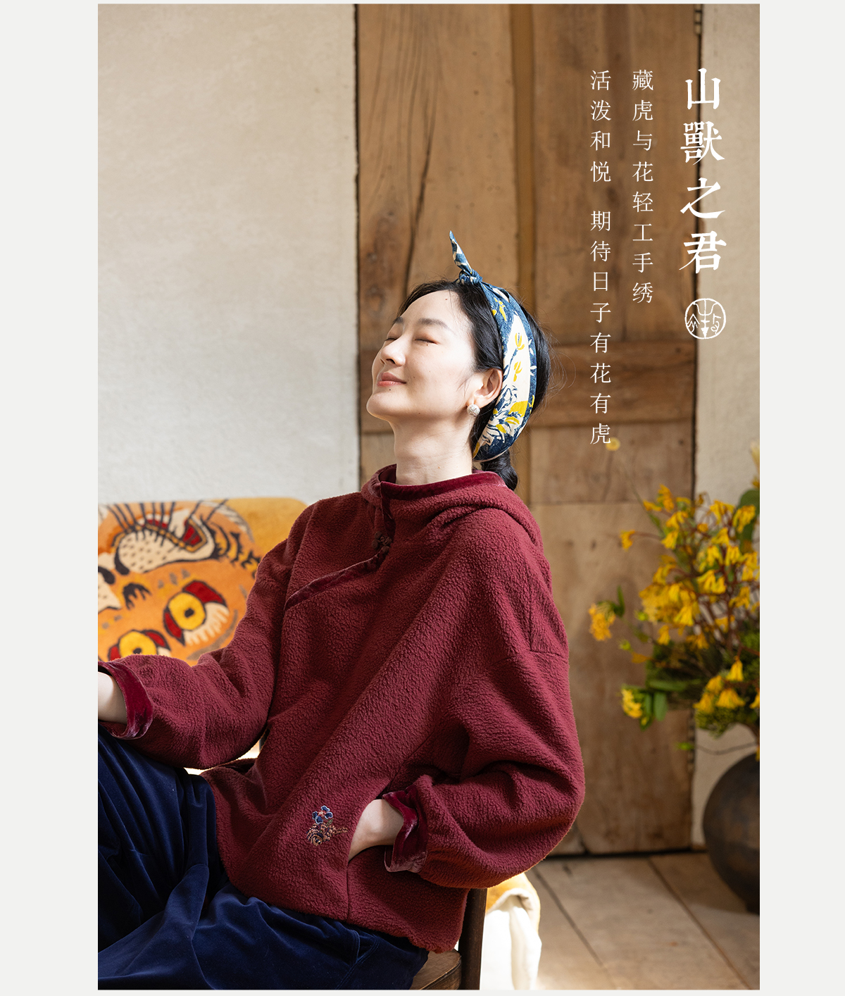 牧衣游原创 老虎与花手工刺绣卫衣舒适保暖厚实红色百搭上衣 萃里