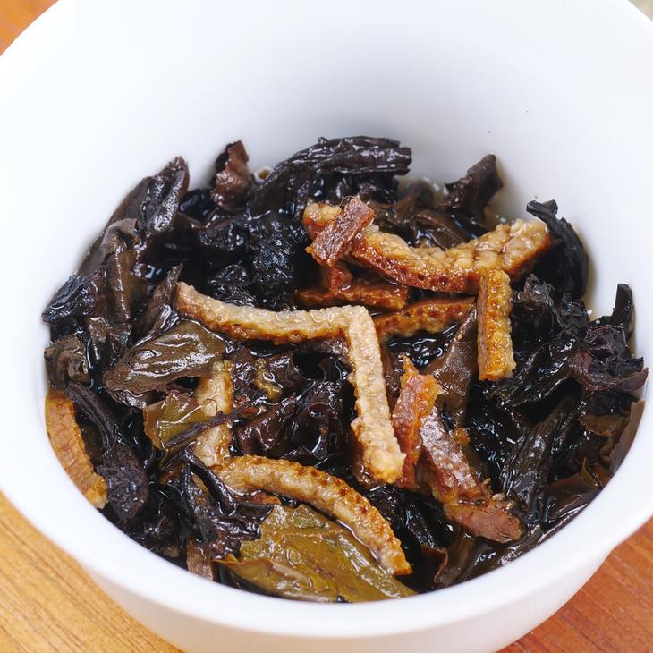 陈皮的加入,其含有的挥发油等成分,能为茶汤带来一丝微妙的清凉感和回甘,使得整体的口感甜润度更高,饮后喉韵舒爽,减少了单饮老茶可能带来的单调感。