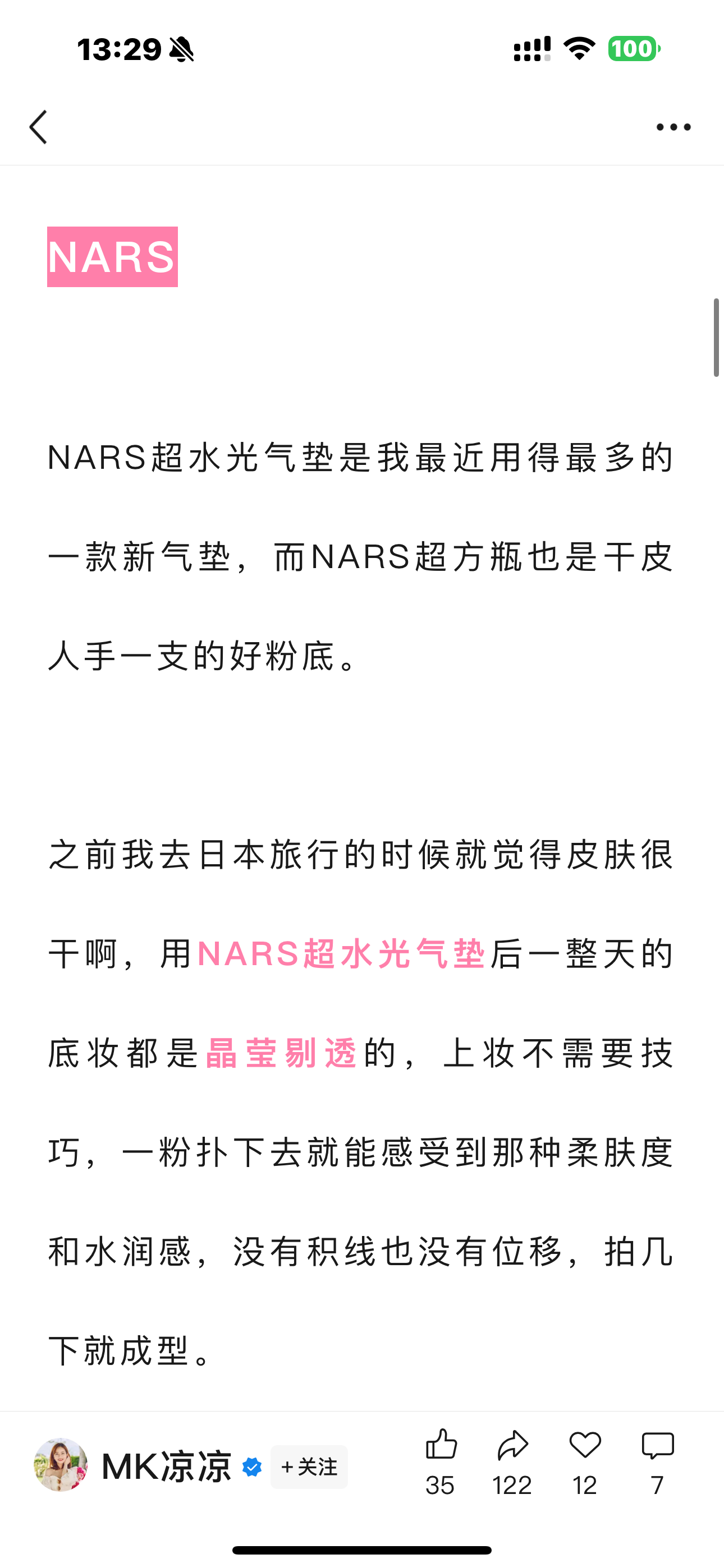 我前几天开彩妆试用会,整张脸卸了又补补了又卸,多次叠加NARS都不会卡粉斑驳,全场没被腮红口红种草,大家都被NARS震惊到了