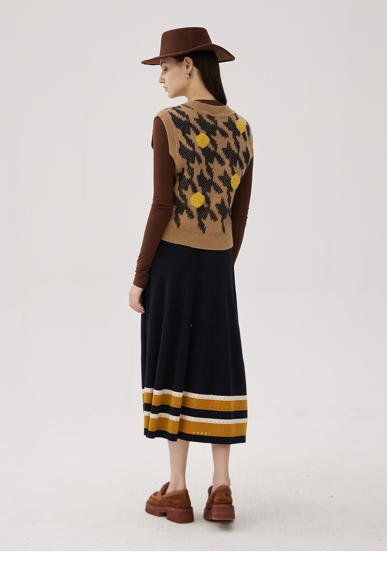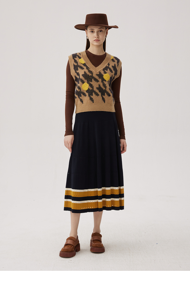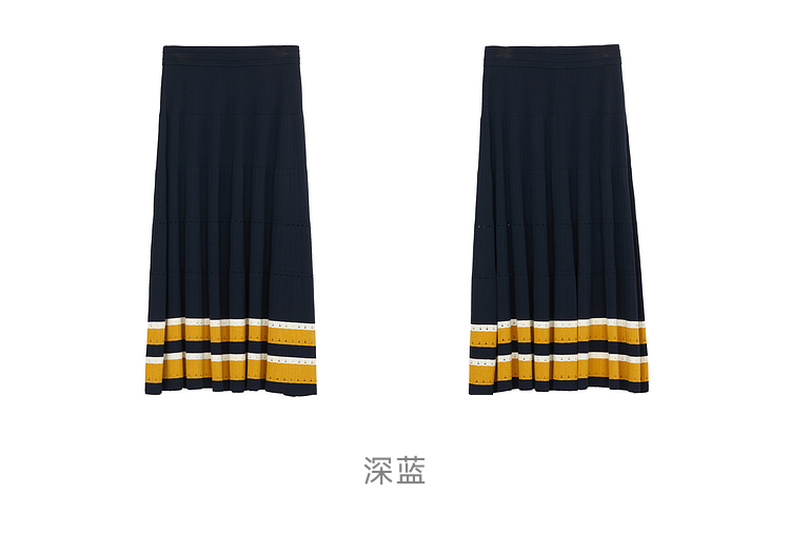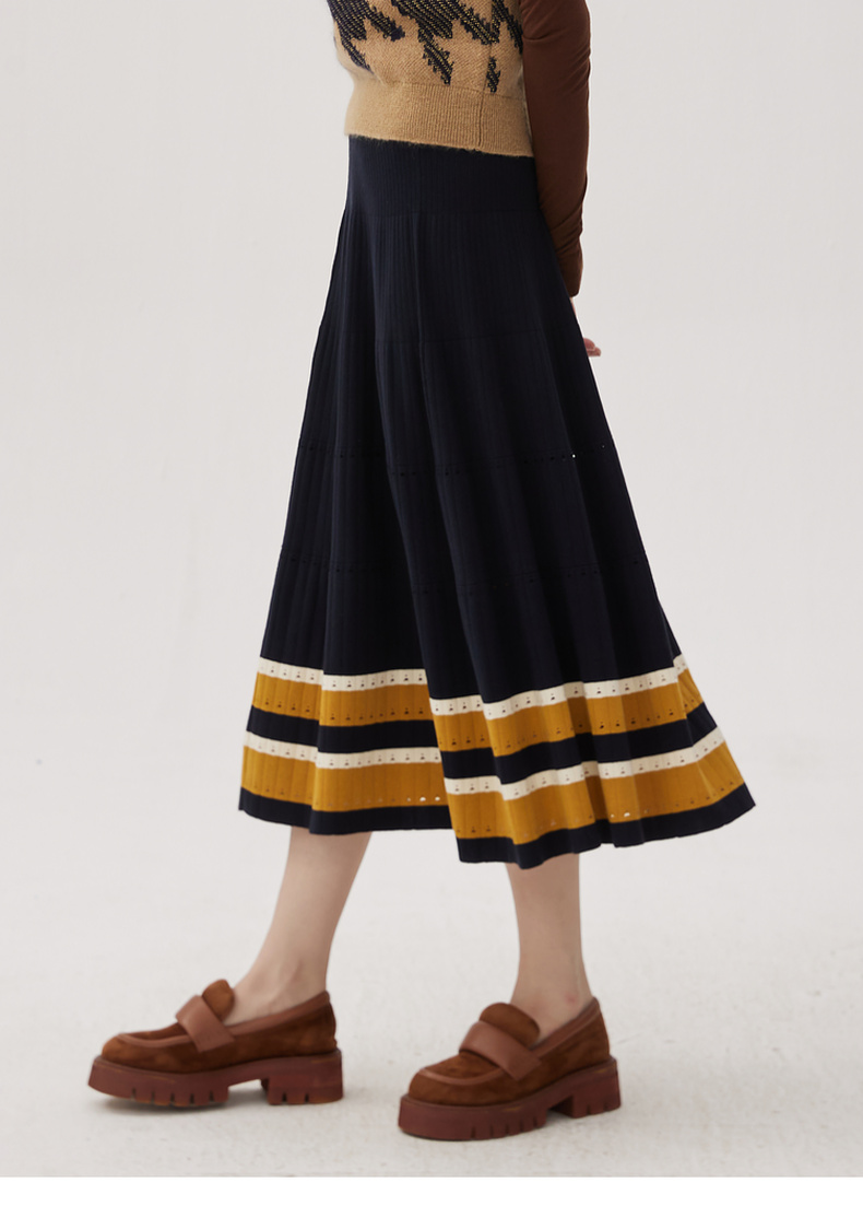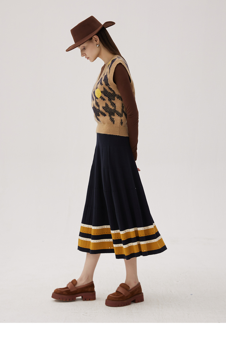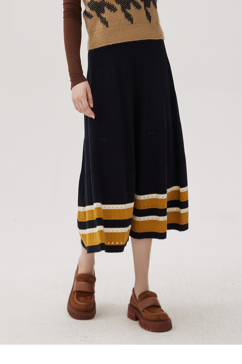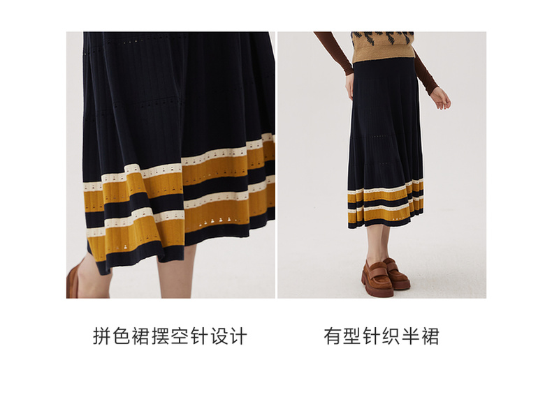谜底针织半身裙2024秋新品文艺风百搭撞色拼接大摆长裙243MZ1303