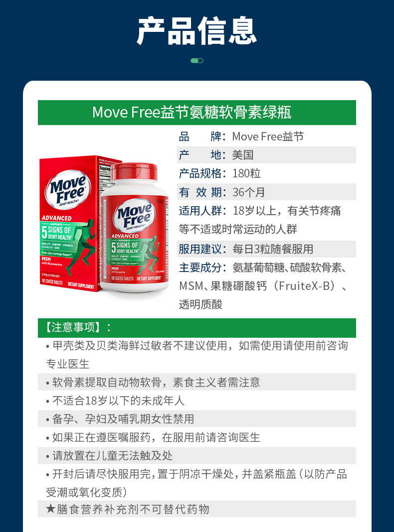 MoveFree 维骨力氨糖软骨素关节宝MSM氨基葡萄糖绿瓶 180粒