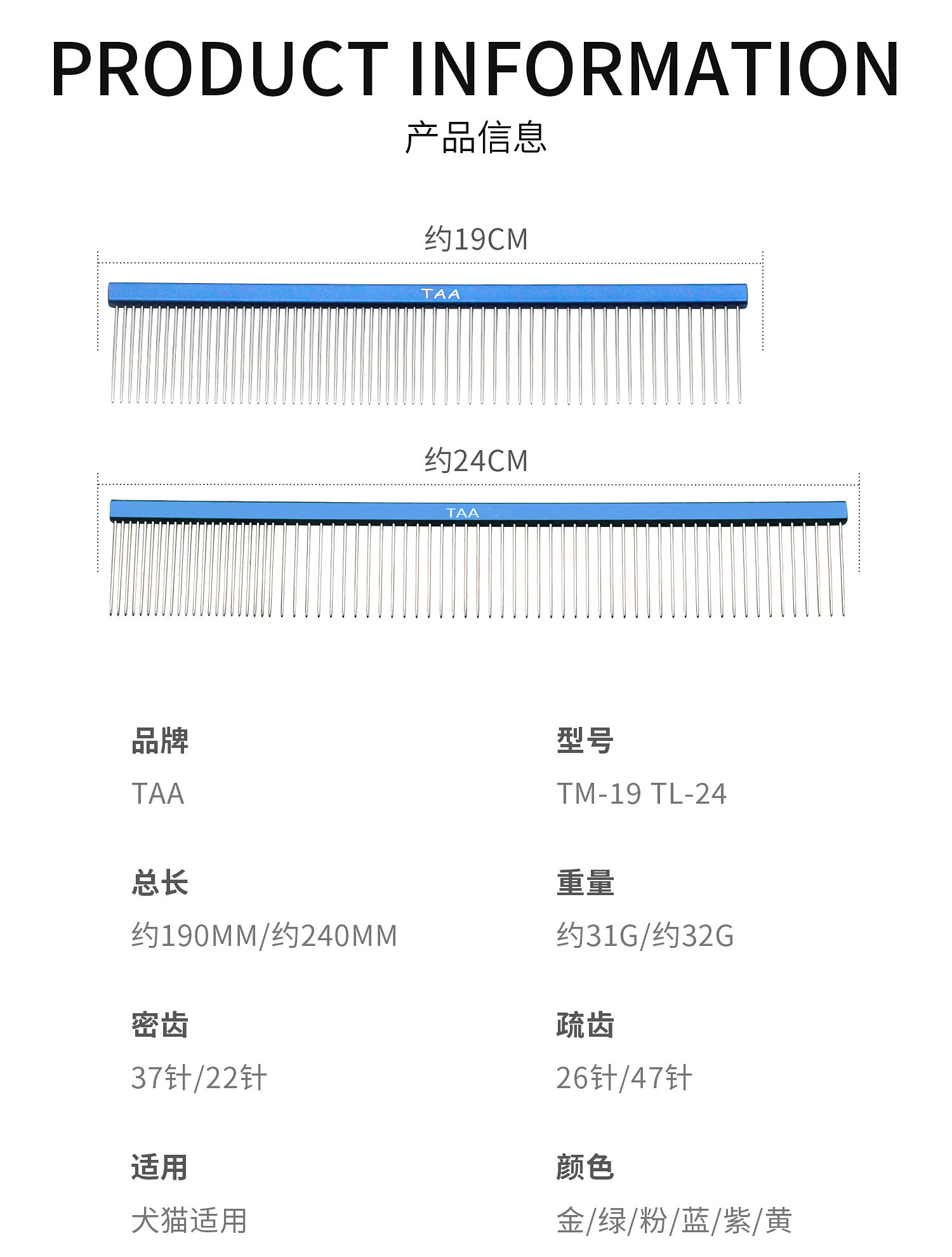 TAA它它宠物美容疏密两齿扁柄排梳TM-19 去除长短浮毛开结