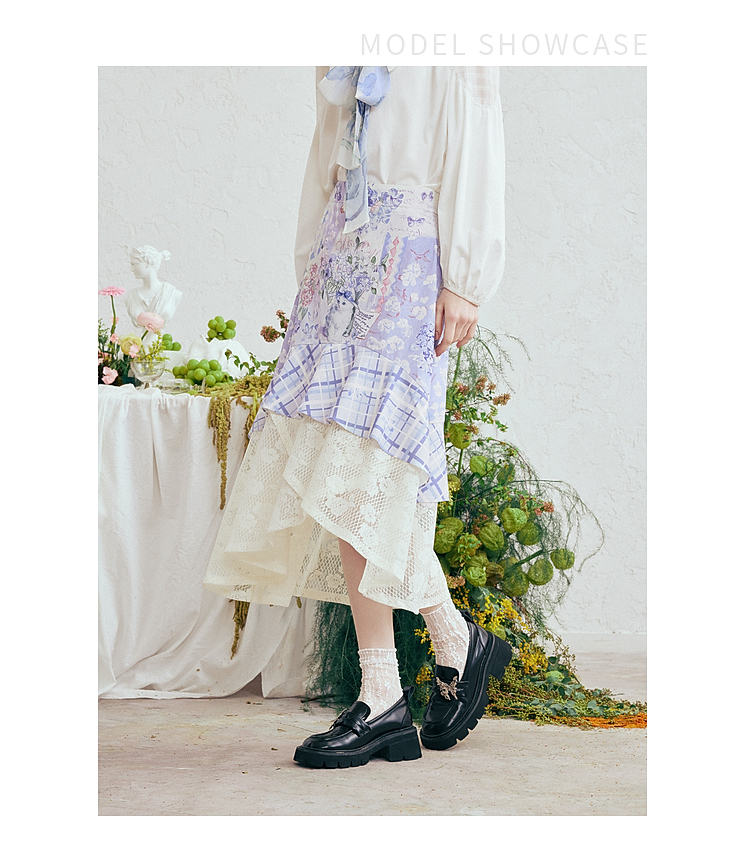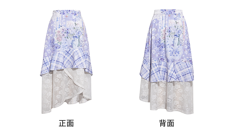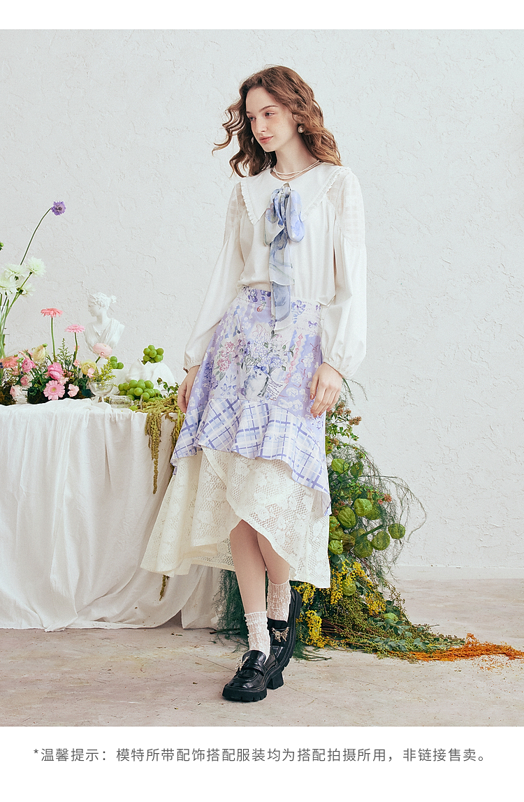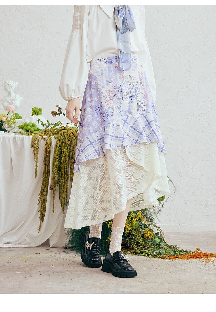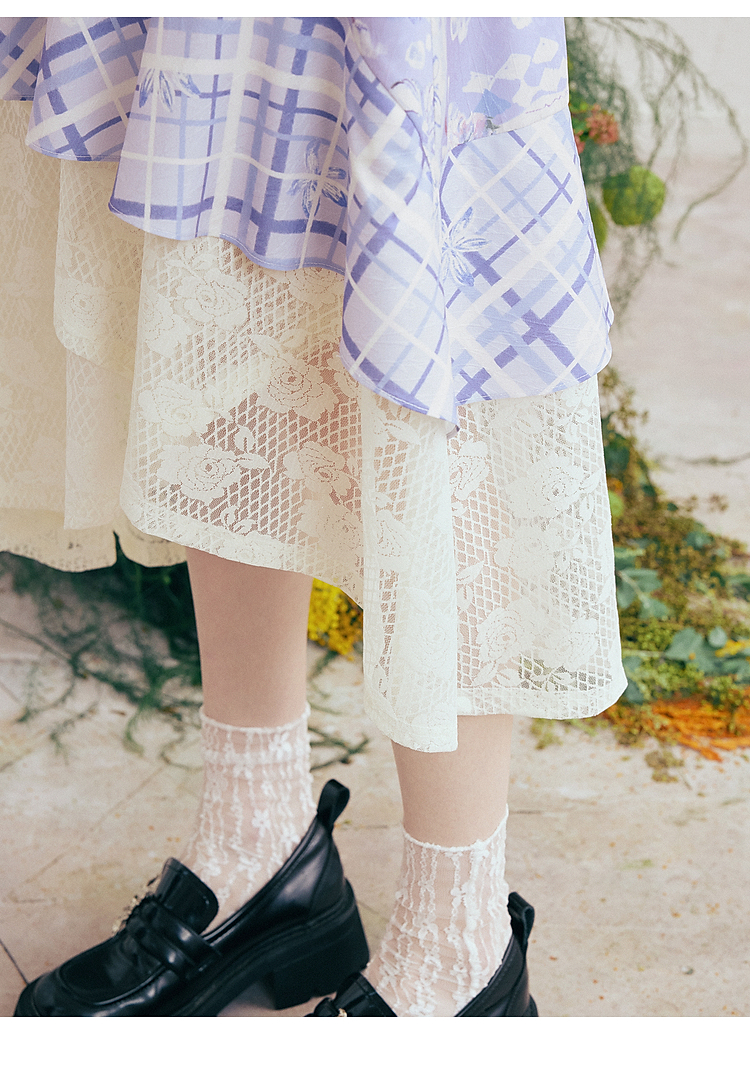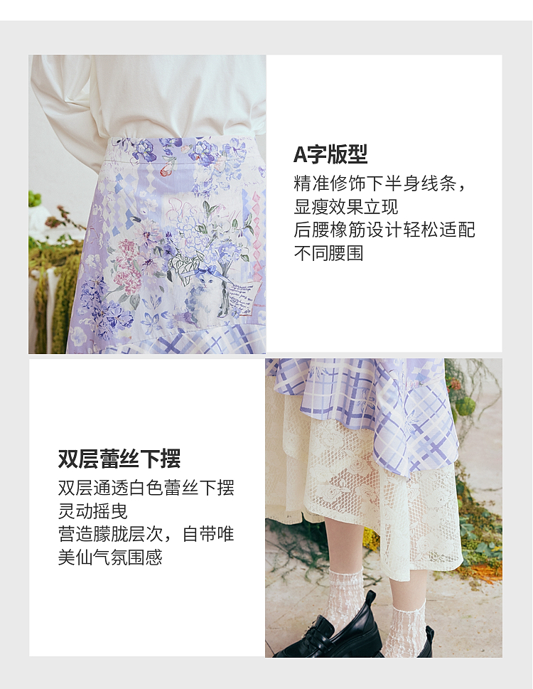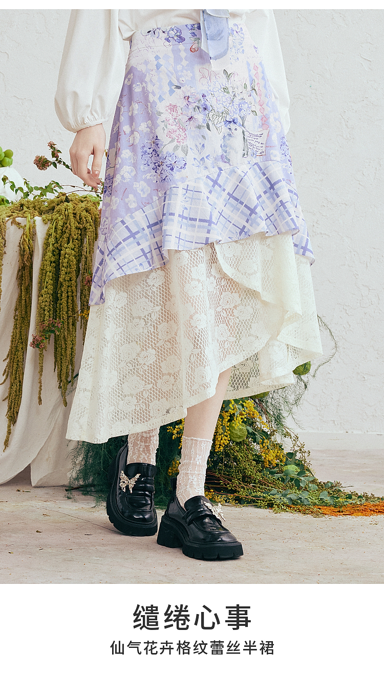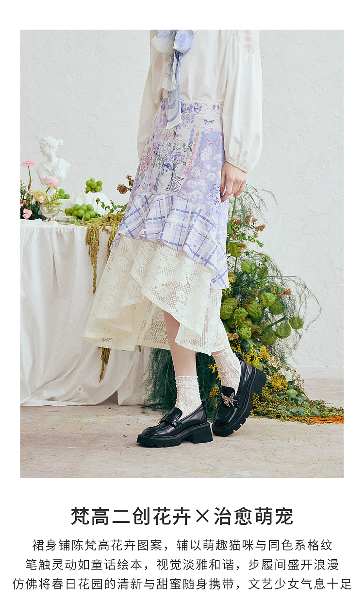 两三事梵高文艺 缱绻心事 2026春季新款蕾丝拼接印花不规则半身裙