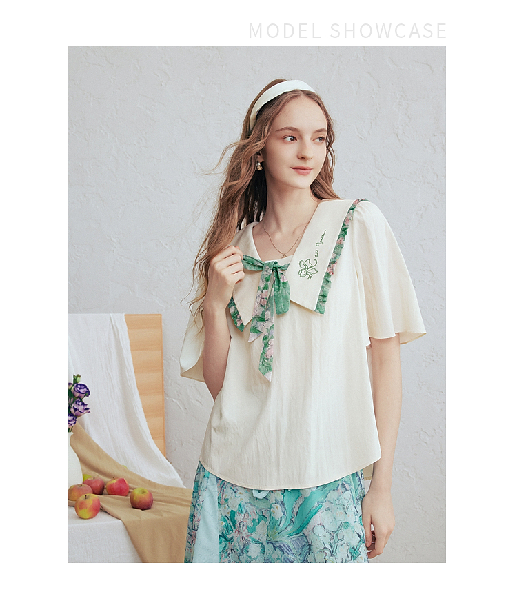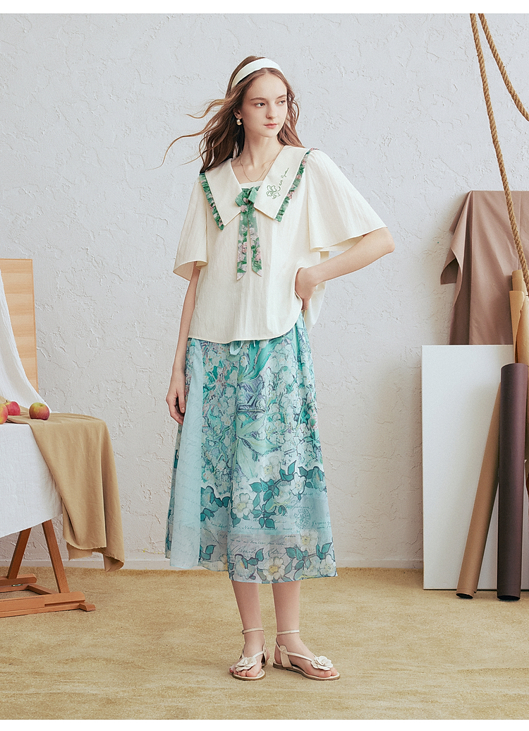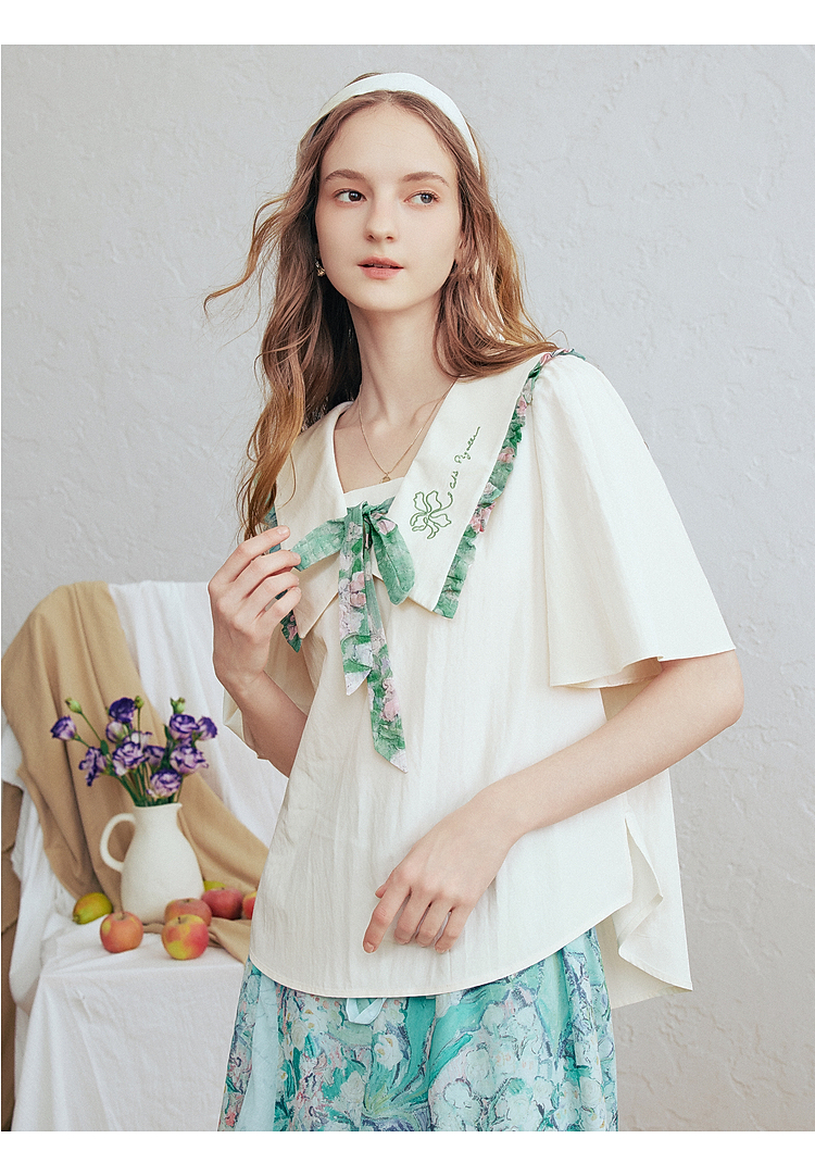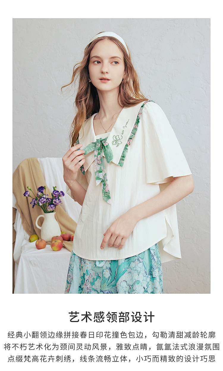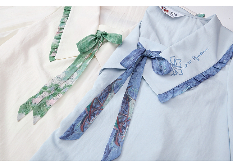 两三事梵高文艺月光废墟2026春新款印花荷叶边刺绣翻领绑带衬衫女