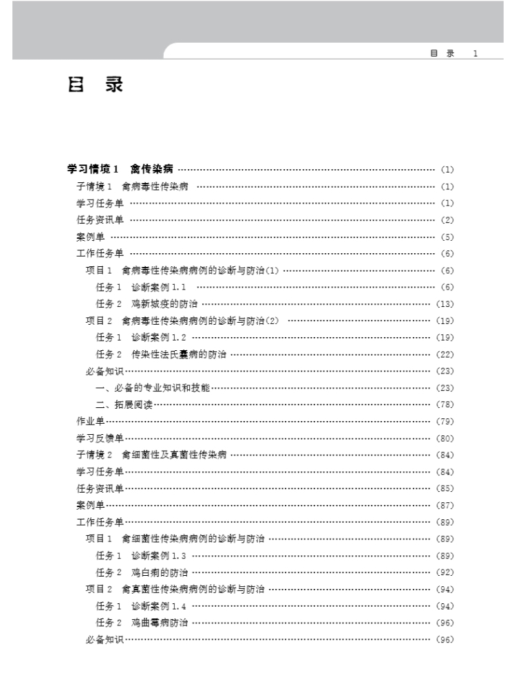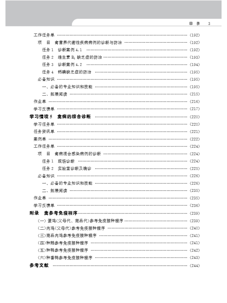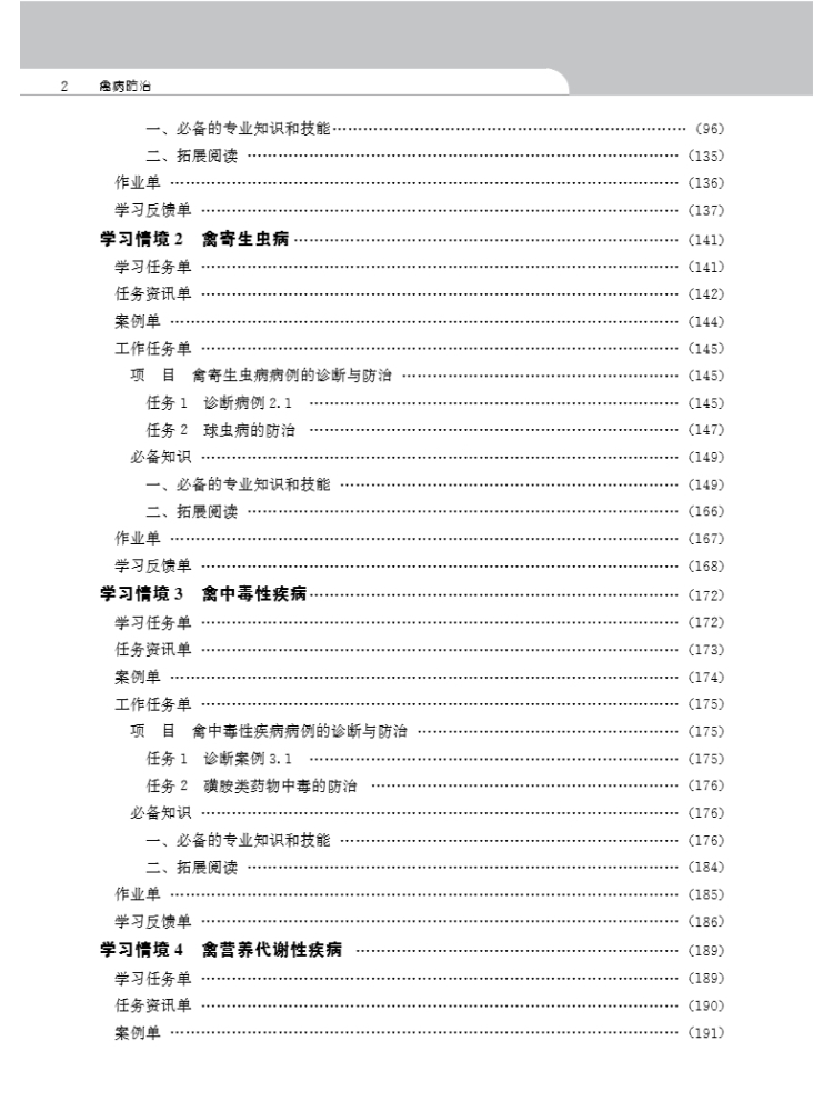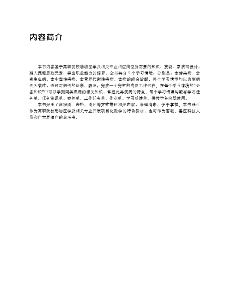 本书内容基于高职院校动物医学及相关专业相应岗位所需要的知识、技能、素质而设计, 融入课程思政元素,突出职业能力的培养。全书共分5个学习情境,分别是:禽传染病、禽 寄生虫病、禽中毒性疾病、禽营养代谢性疾病、禽病的综合诊断。每个学习情境均以典型病 例为载体,通过对病例的诊断、防治,完成一个完整的岗位工作过程。在每个学习情境的“必 备知识”中可以学到同类疾病的相关知识,掌握此类疾病的特点。每个学习情境均配有学习任 务单、任务资讯单、案例单、工作任务单、作业单、学习反馈单,供教学各阶段使用。
