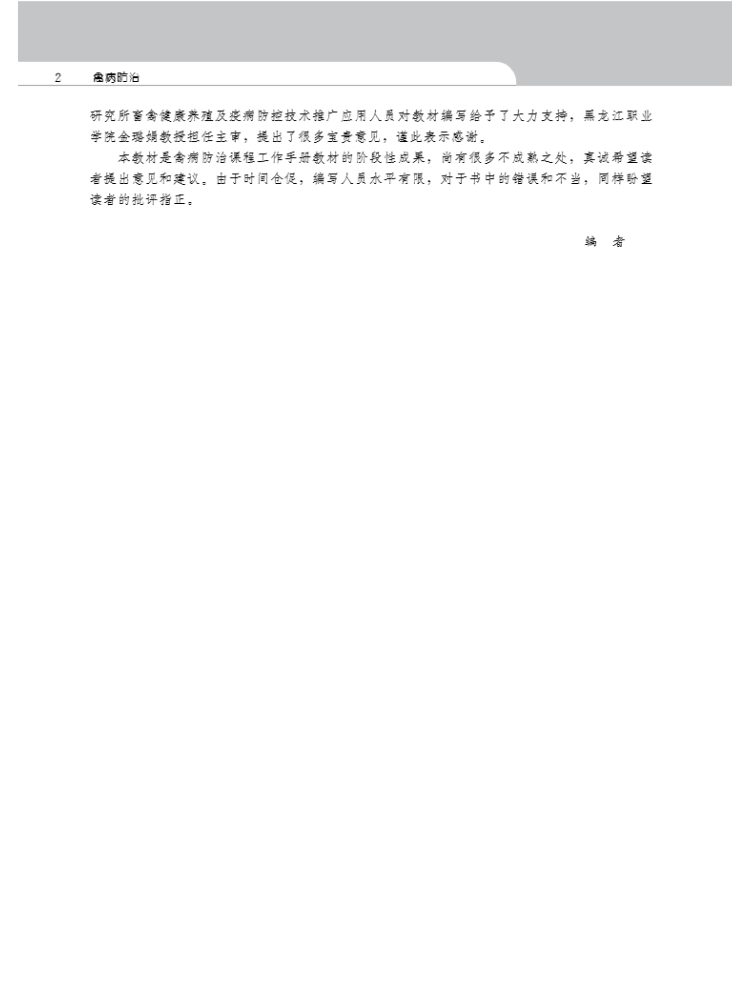 本书采用了流程图、表格、图片等方式描述相关内容,条理清晰,便于掌握。本书既可 作为高职院校动物医学及相关专业开展项目化教学的特色教材,也可作为畜牧、兽医科技人 员和广大养殖户的参考书。