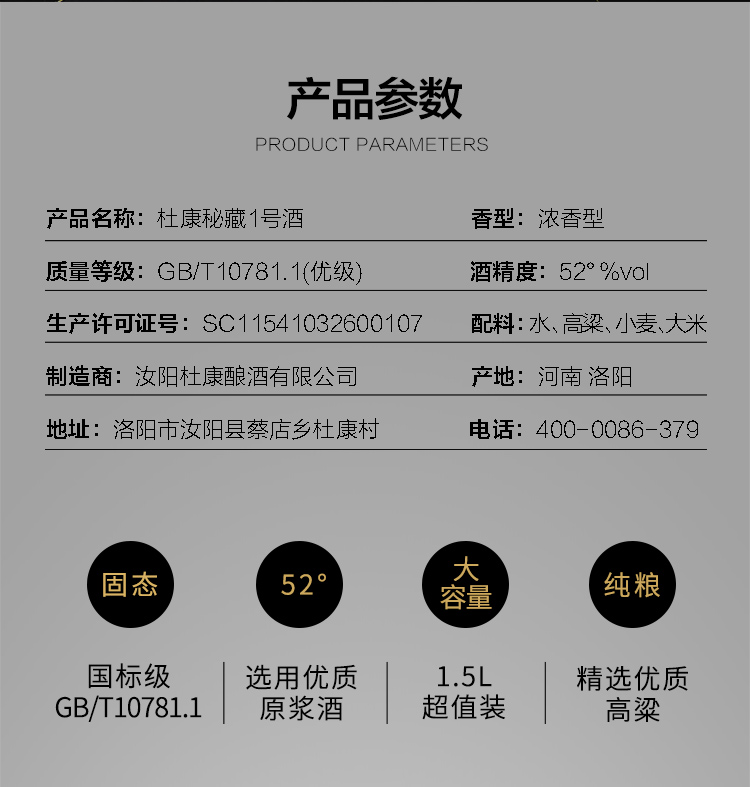 【3斤大容量】杜康秘藏1号 52度1.5L瓶大容量纯粮优级酒
