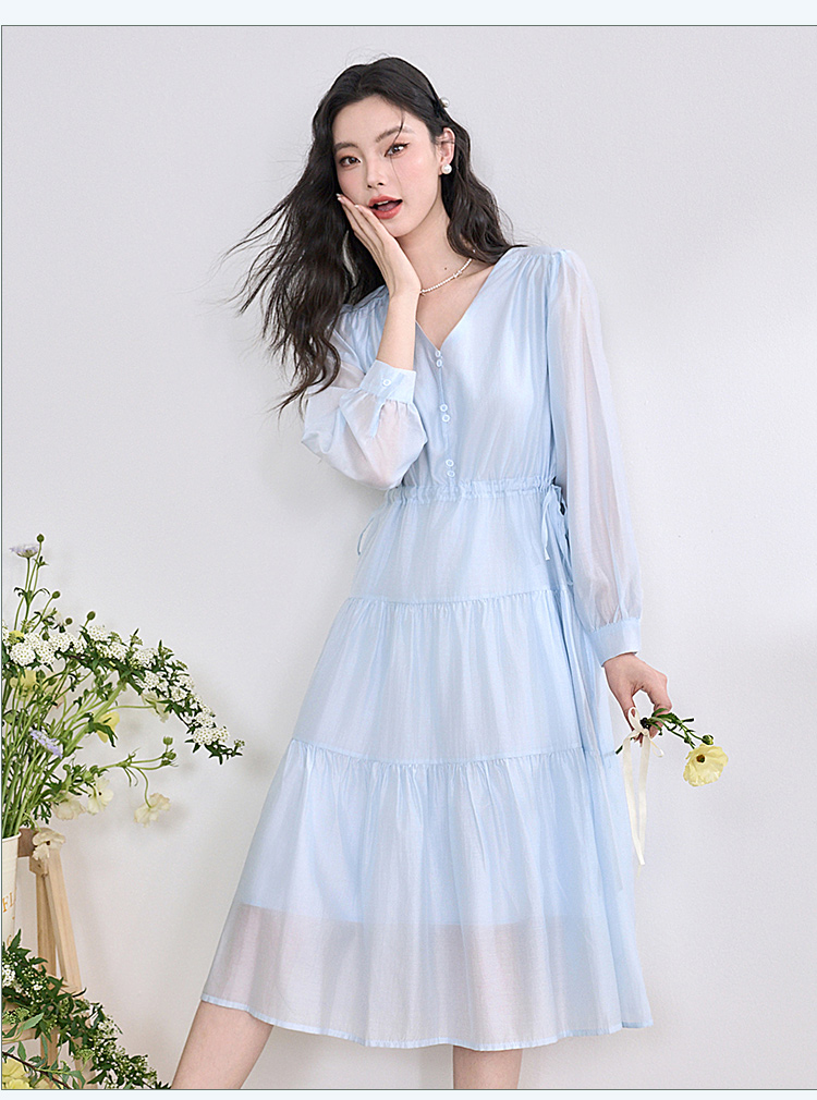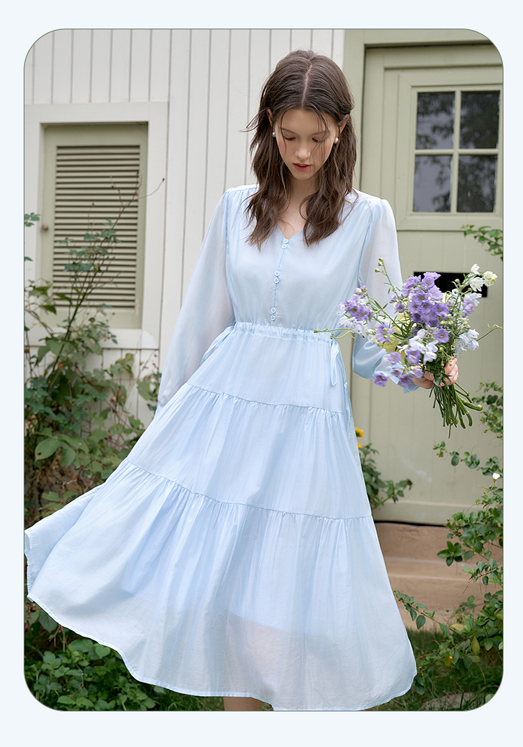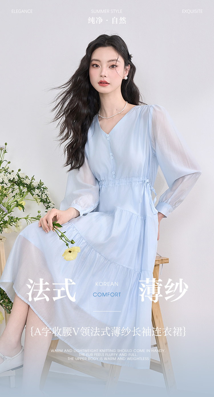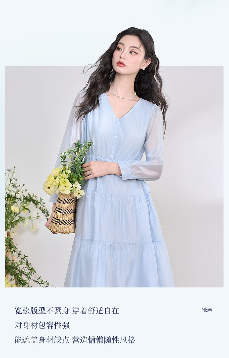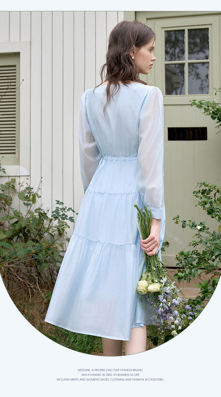西遇法式薄纱长袖连衣裙女新款蓝色a字收腰v领长裙D0050489