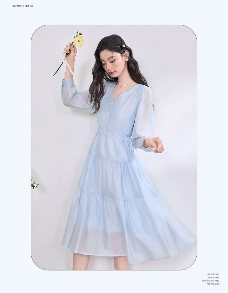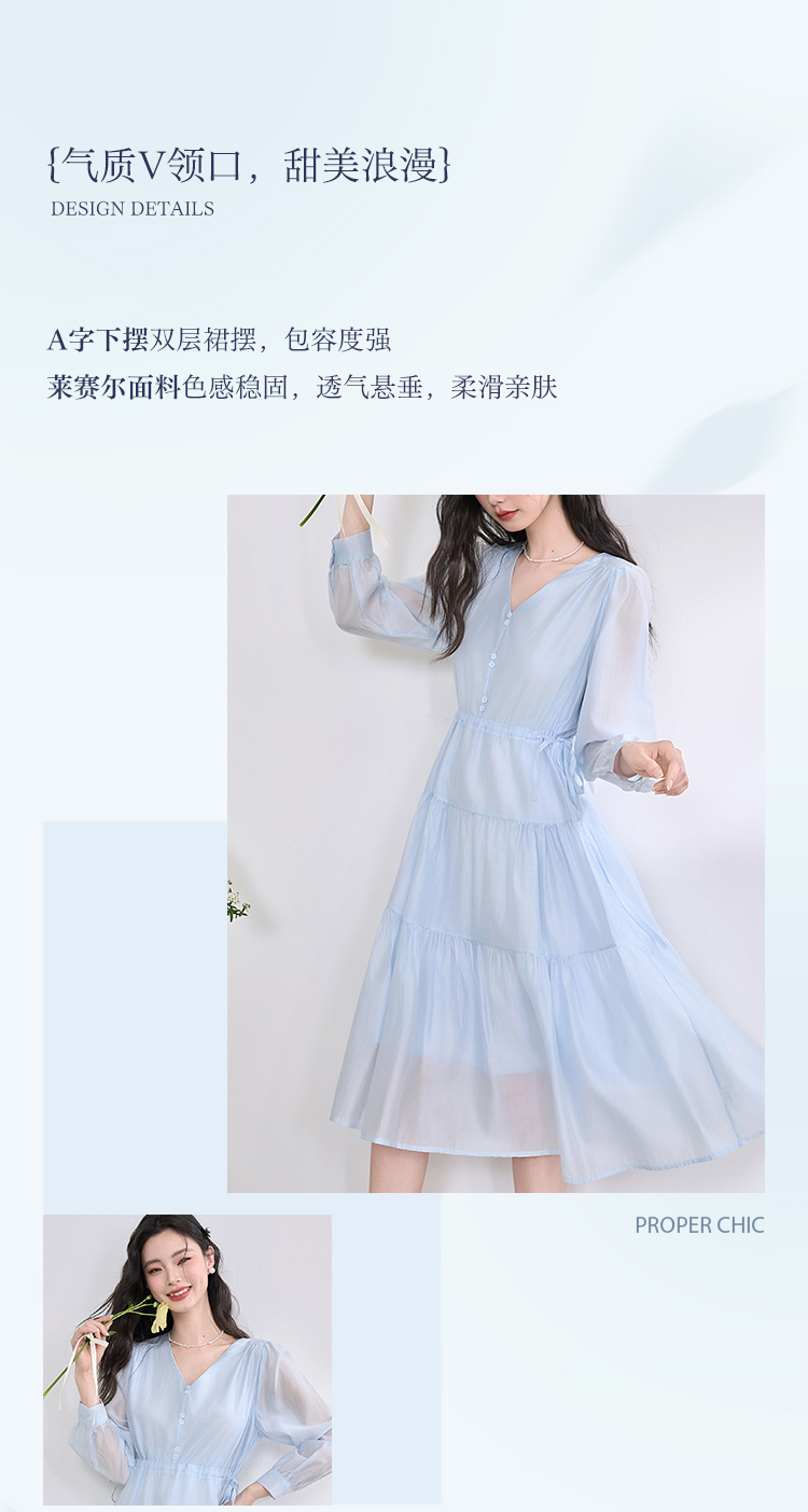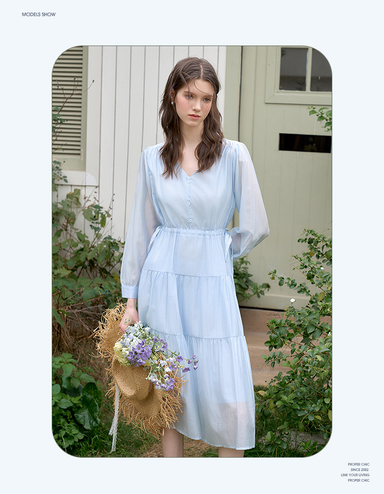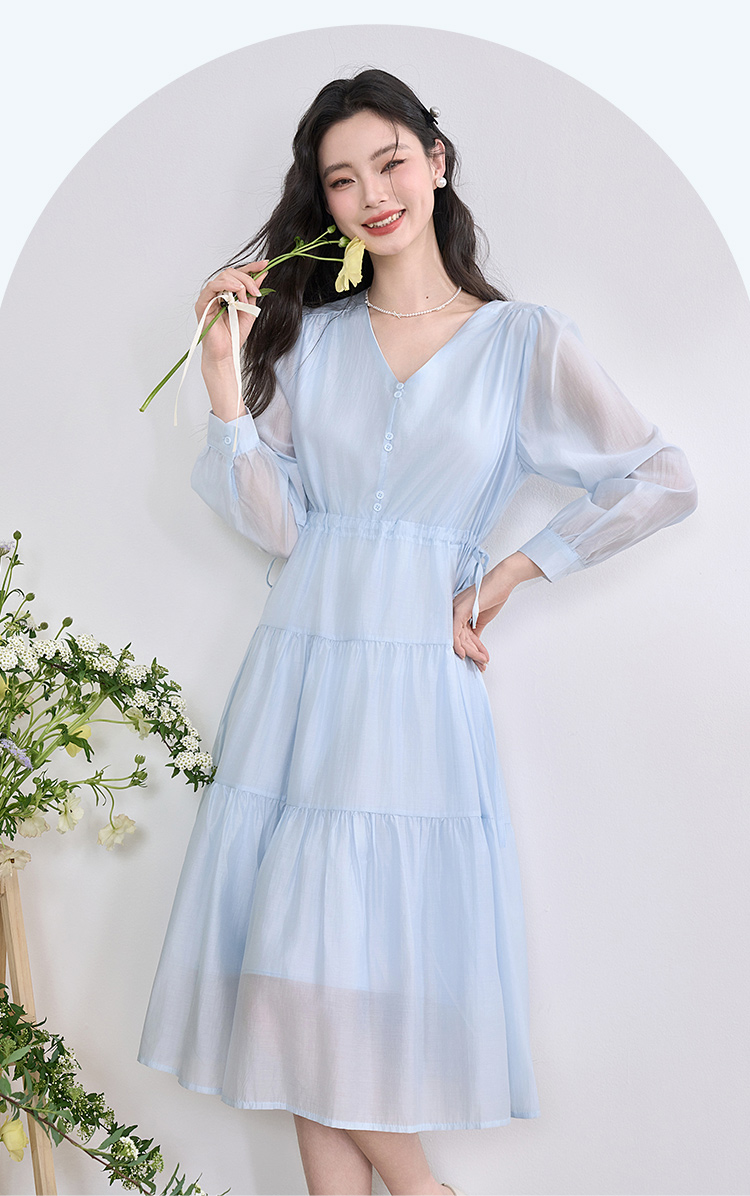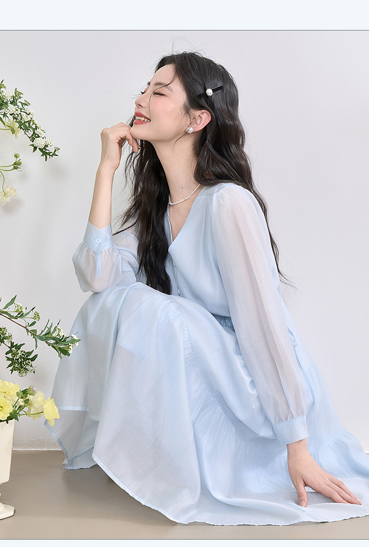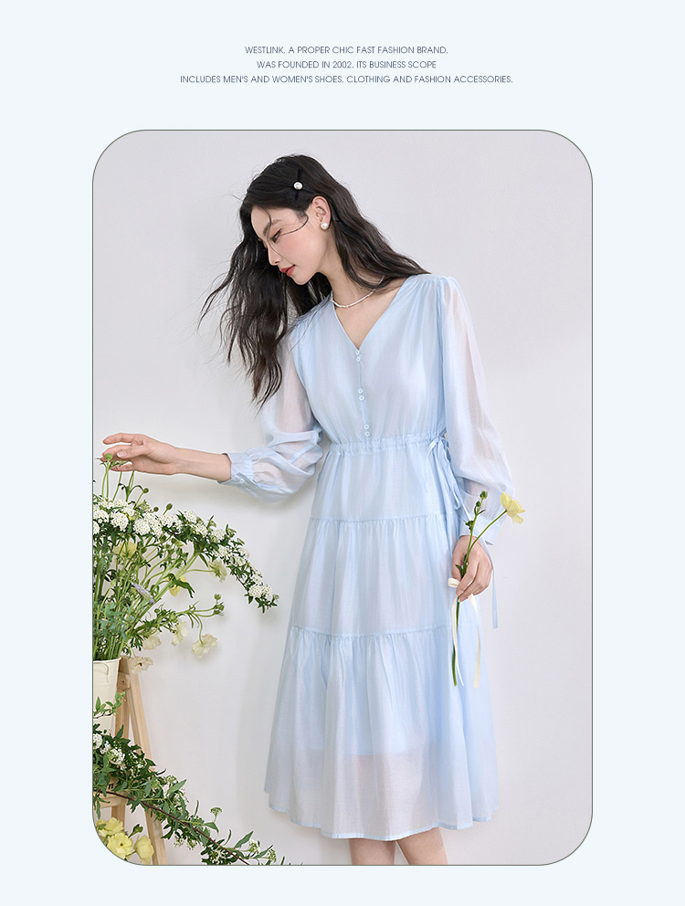 西遇法式薄纱长袖连衣裙女新款蓝色a字收腰v领长裙D0050489