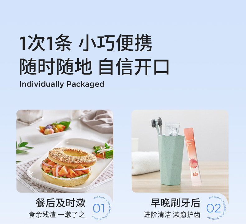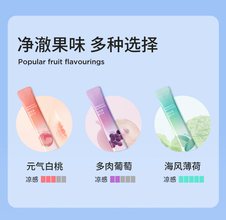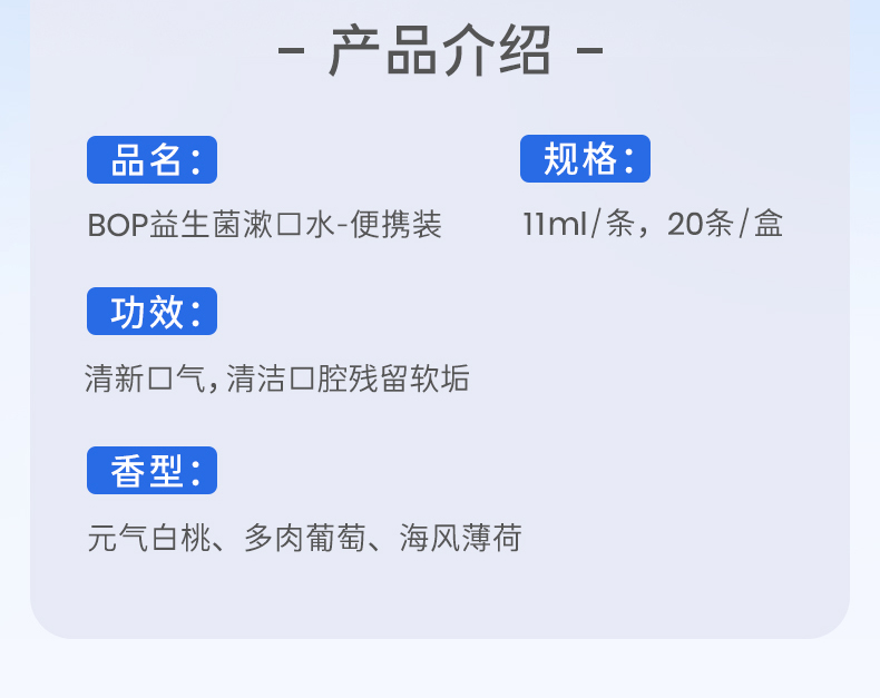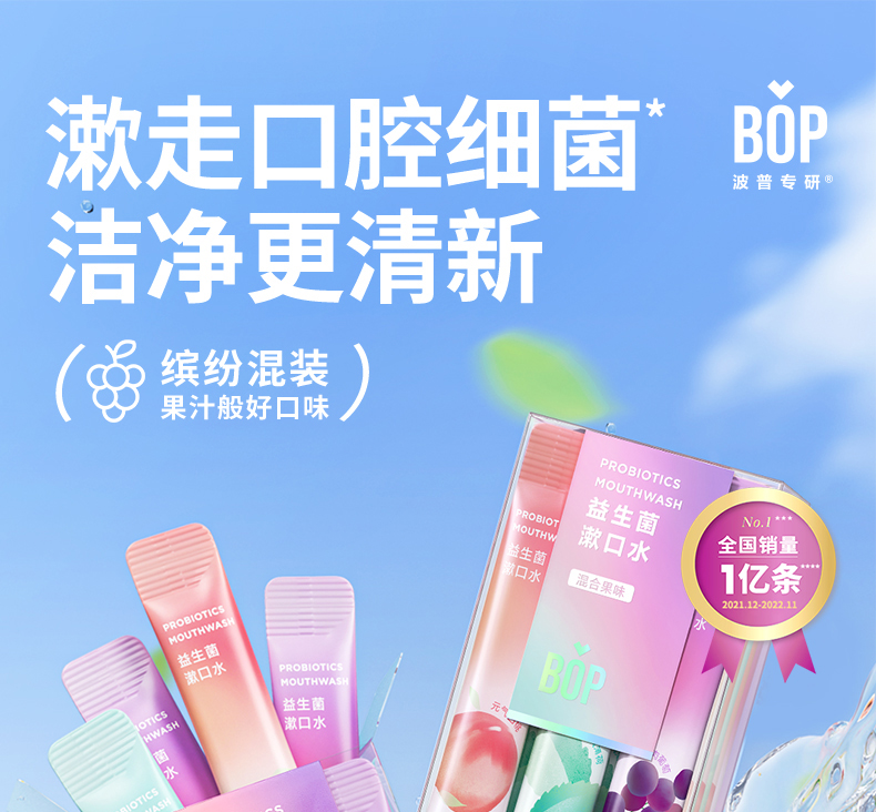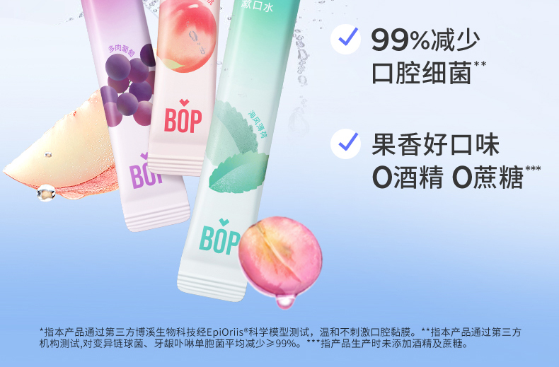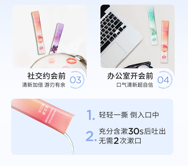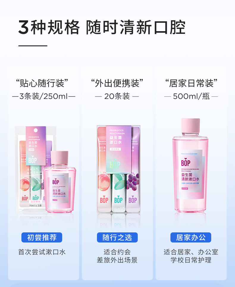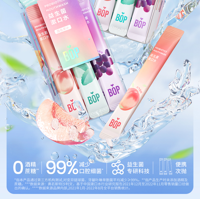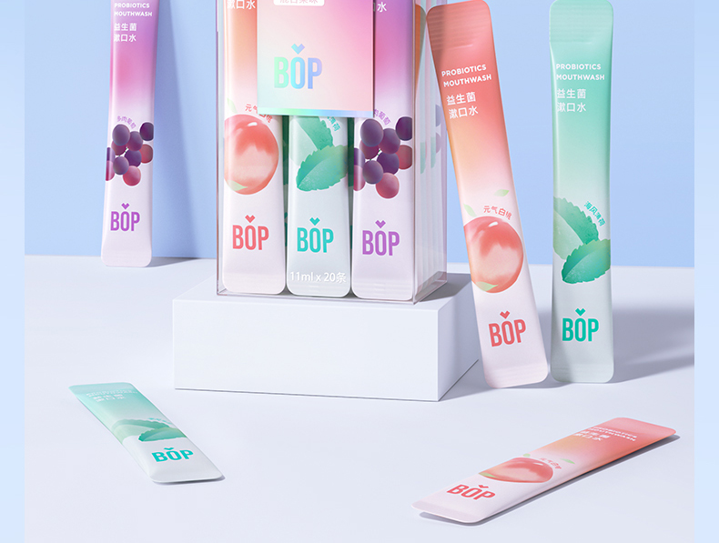 BOP | 益生菌条装便携式漱口水 混装20条*3盒 元气白桃+多肉葡萄+海风薄荷(送2支20g的抗菌肽牙膏)