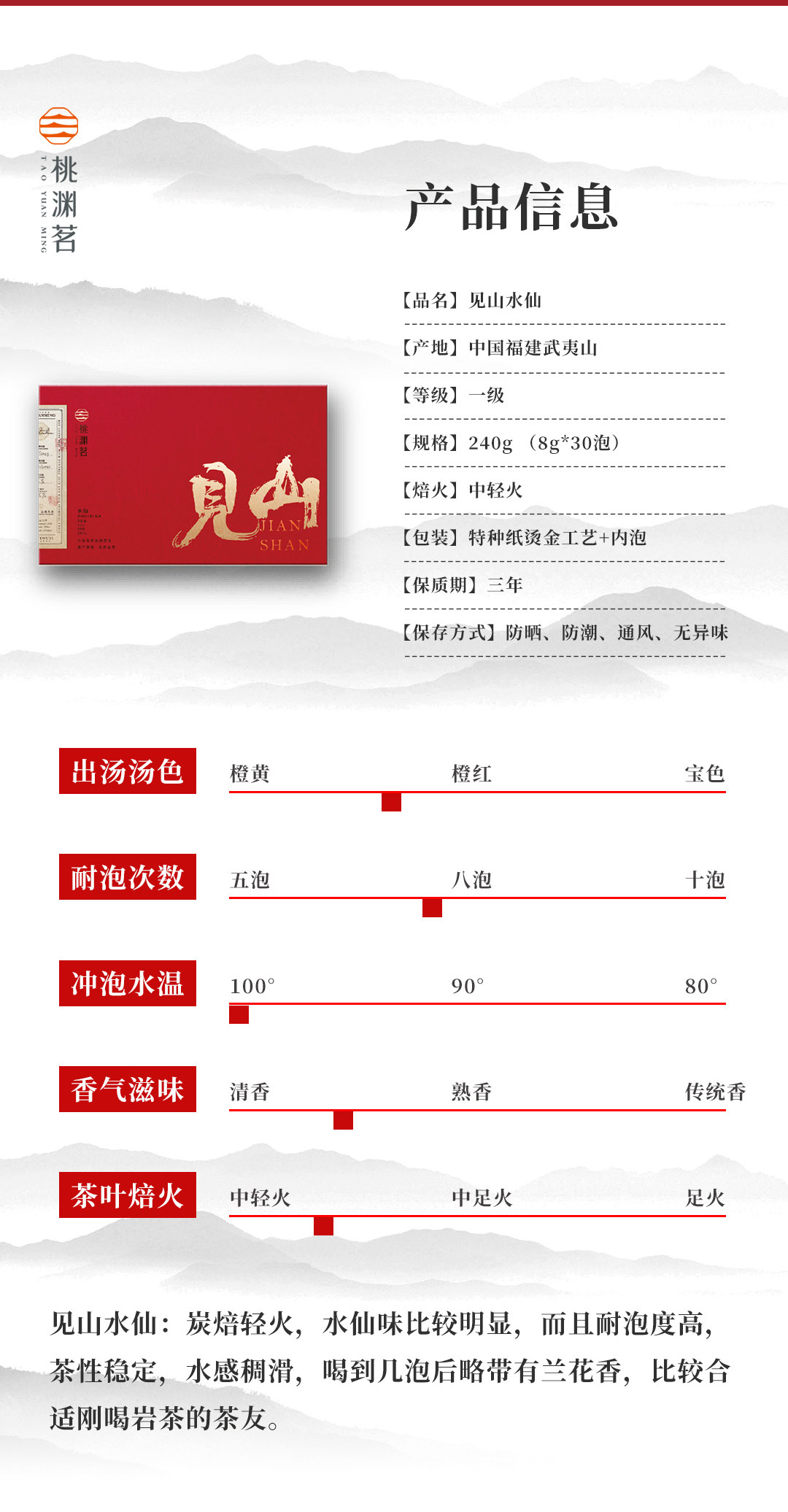 【水感稠滑 炭焙轻火】桃渊茗 见山 一级水仙 武夷岩茶 240g/盒 礼盒装