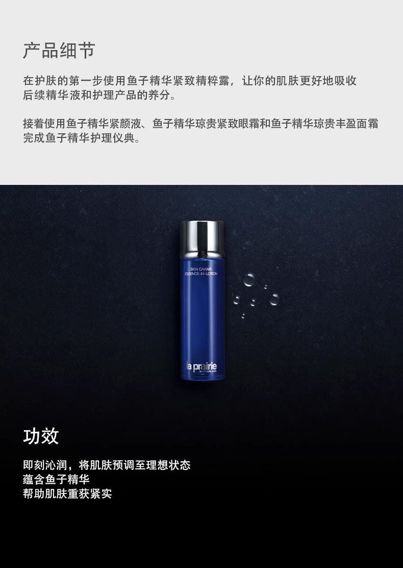 满蕴鱼子精华水的La Prairie莱珀妮鱼子精华紧致精粹露,将赋予你全新鱼子奢养体验,让肌肤更现盈盈水润,提升和紧致护肤的第一步,由此开启。