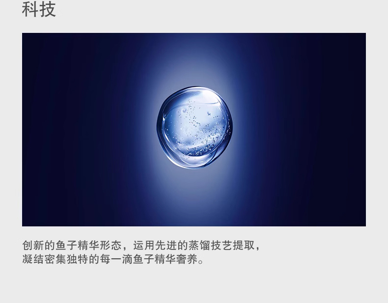 科技上,研发专家们也首度利用高科技蒸馏工艺,让鱼子精华一滴一滴保留了下来,更能突显鱼子精华的护肤特性。独特的水状精华,质地清澈而轻盈,就像晶露一般,看着就十分金贵。