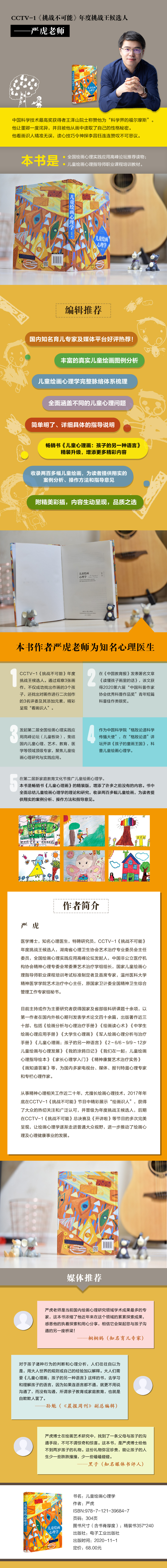 严虎 医学博士,知名心理医生,特聘研究员,CCTV-1《挑战不可能》年度挑战王候选人,湖南省心理卫生协会艺术治疗专业委员会主任委员,全国绘画心理实践应用高峰论坛发起人,中国非公立医疗机构协会精神心理专委会常委兼艺术治疗学组组长,国家儿童绘画心理指导师职业课程培训考试标准制定者及首席专家,温州医科大学精神医学学院艺术治疗中心主任,原国家卫计委全国精神卫生综合管理工作专家组秘书。目前主持或作为主要研究者获得国家及省部级科研课题十余项,以**作者在国内外核心期刊发表学术论文四十余篇,出版著作近三十部,包括《绘画分析与心理治疗手册》《绘画读心术》《中学生绘画心理应用手册》《大学生心理画》《军人绘画心理分析与治疗手册》《儿童心理画:孩子的另一种语言》《2~6/6~9/9~12岁儿童绘画与心理发展》《我的涂鸦日记》《我们在一起:儿童绘画心理指导绘本》《家长心理学入门》《精神康复艺术治疗实务》《画知道答案》等,为国内多家电视台、媒体、报刊特邀心理专家和专栏心理作家。从事精神心理相关工作近二十年,尤擅长绘画心理技术,2017年年底在CCTV-1《挑战不可能》节目中精彩展示“绘画识人”,获得了大众的热切关注和广泛认可,并晋级为年度挑战王候选人,后期在CCTV-1《挑战不可能》总决赛及《开讲啦》等节目的多次完美呈现,让绘画心理学逐渐走进普通大众视野,进一步推动了绘画心理及心理健康事业的发展。