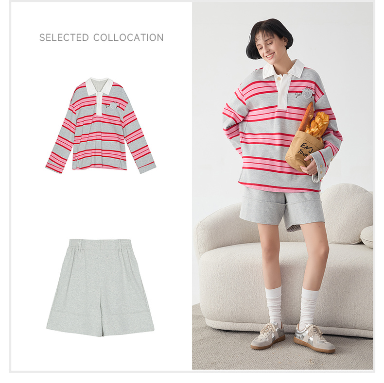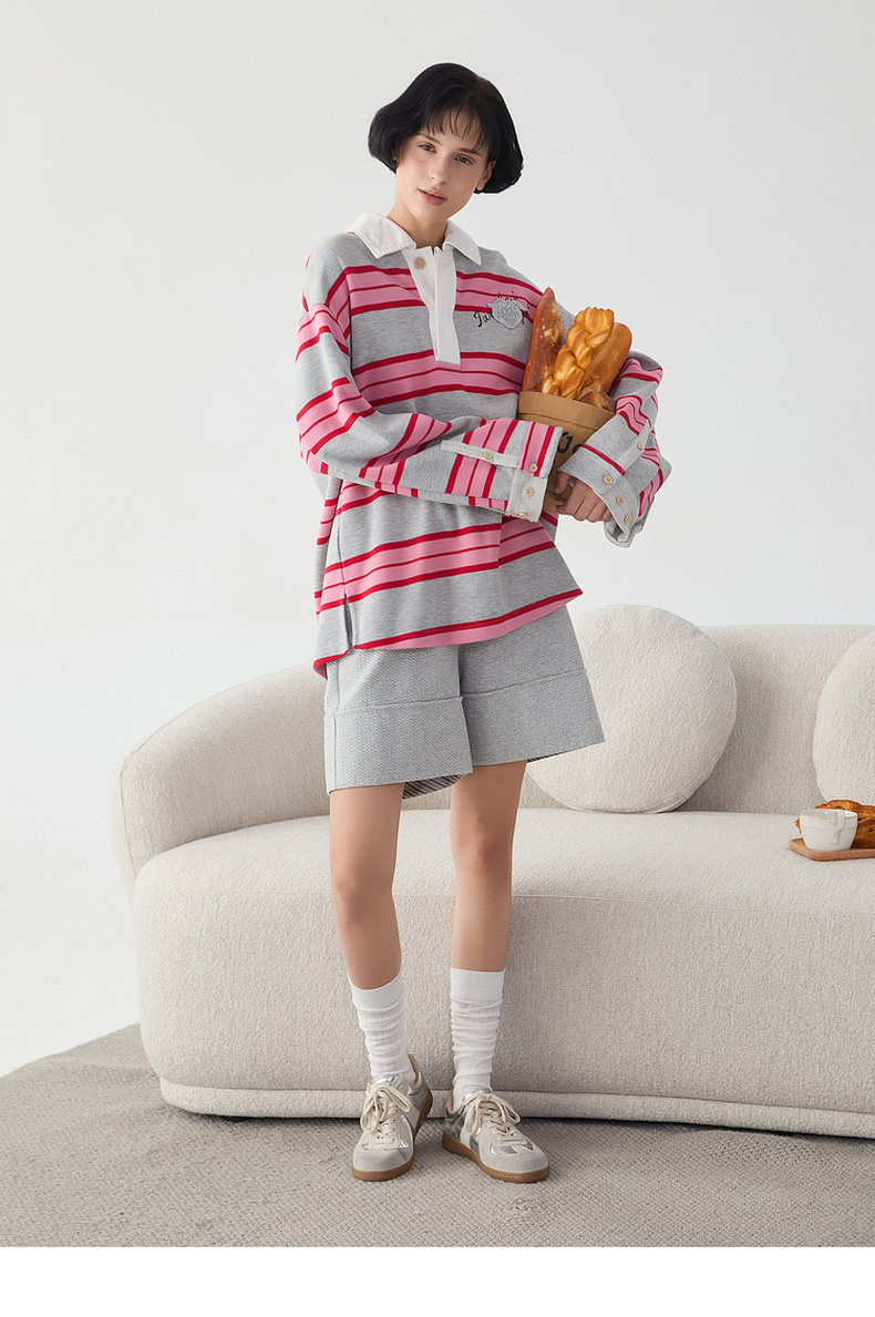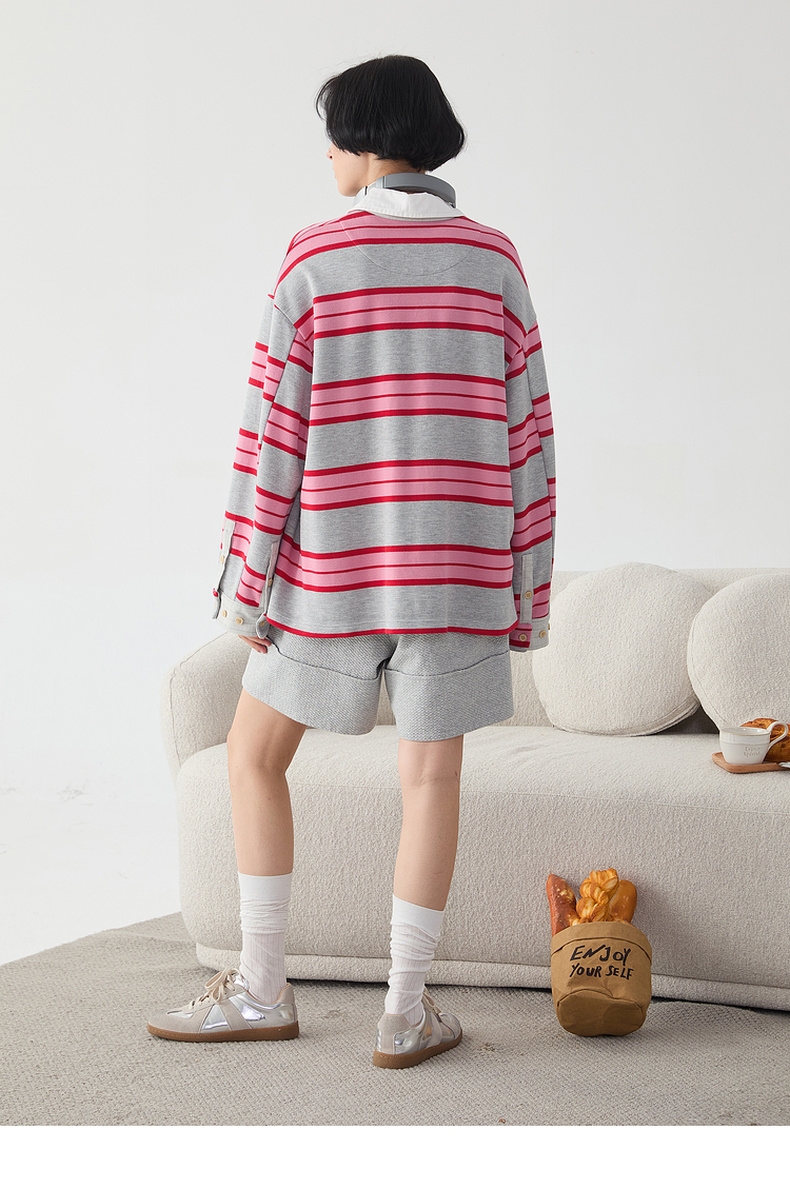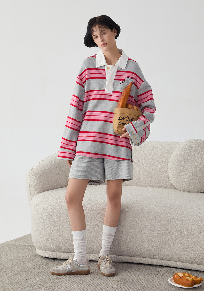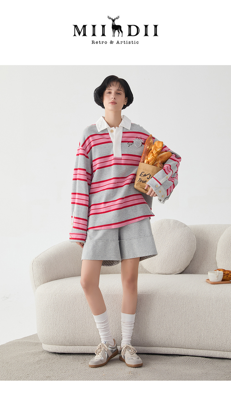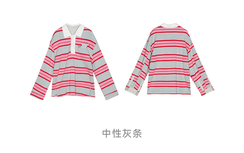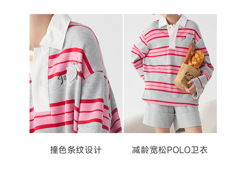 谜底条纹POLO衫上衣女2025春季新品学院风百搭宽松卫衣251MV0070