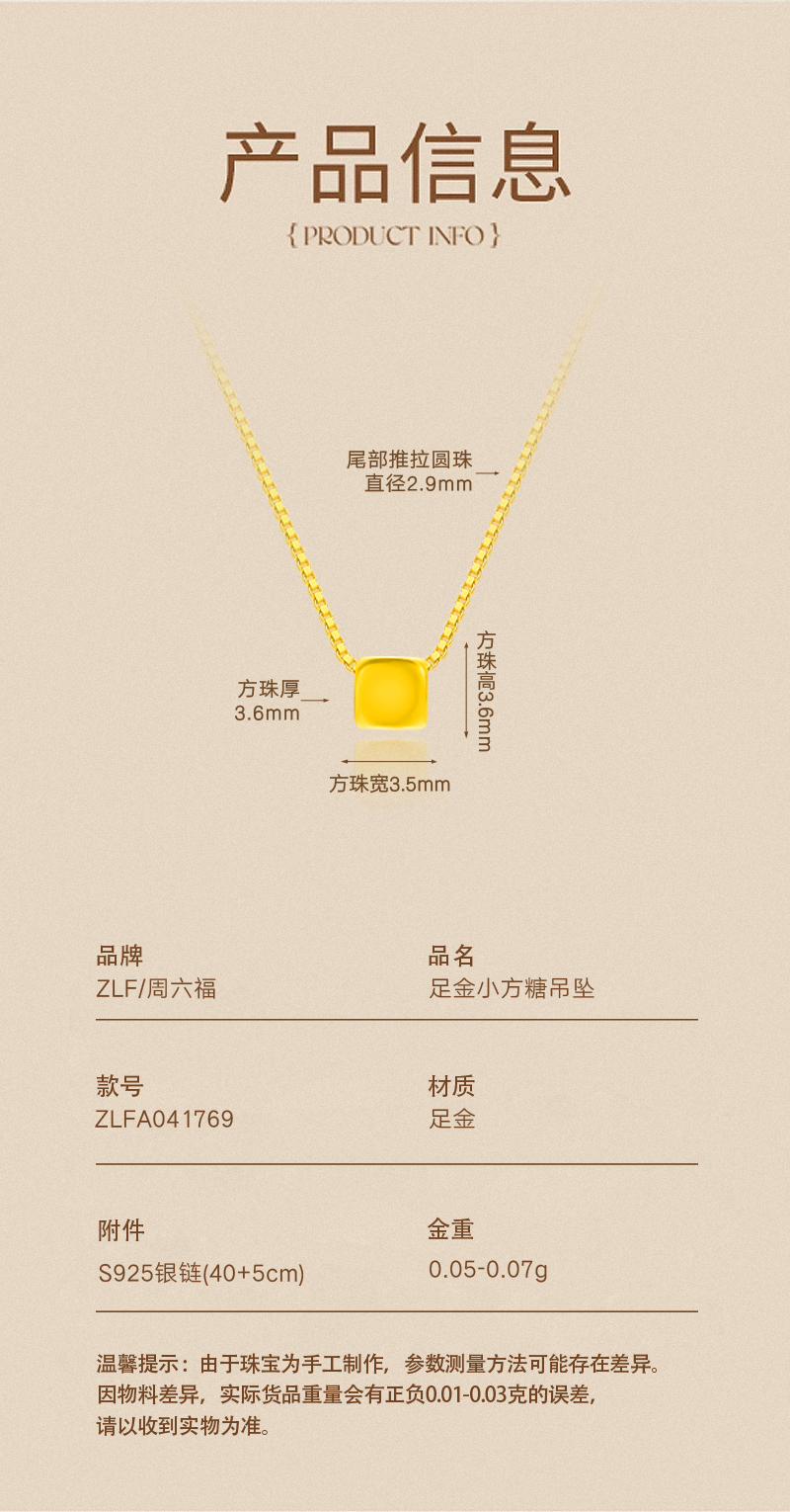 周六福足金小方糖吊坠(送礼盒礼袋)