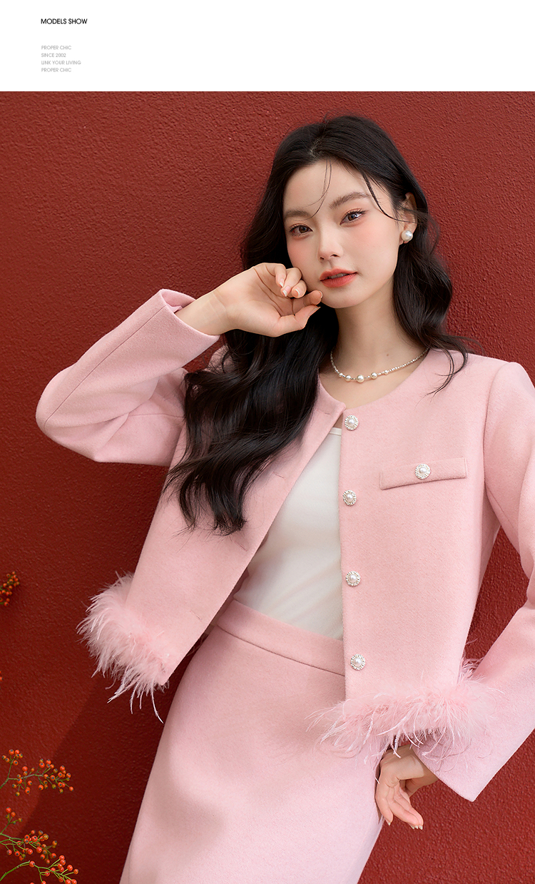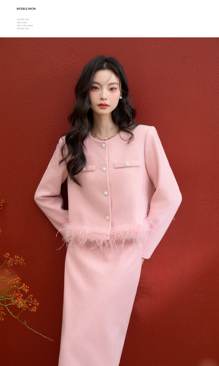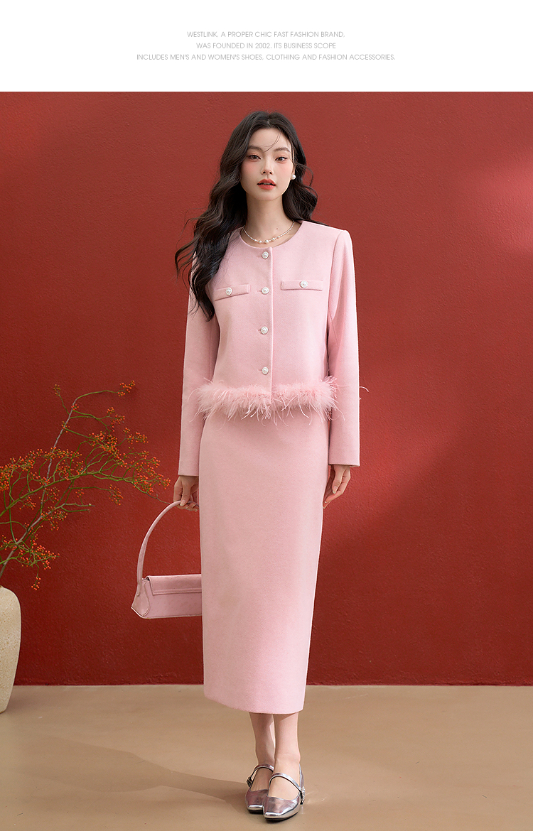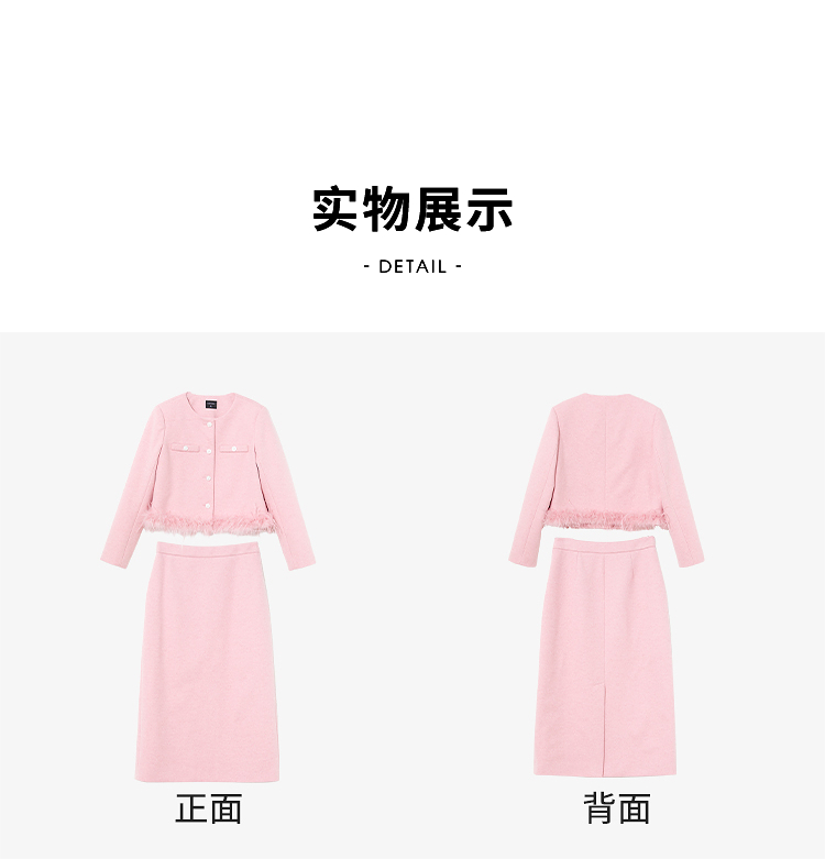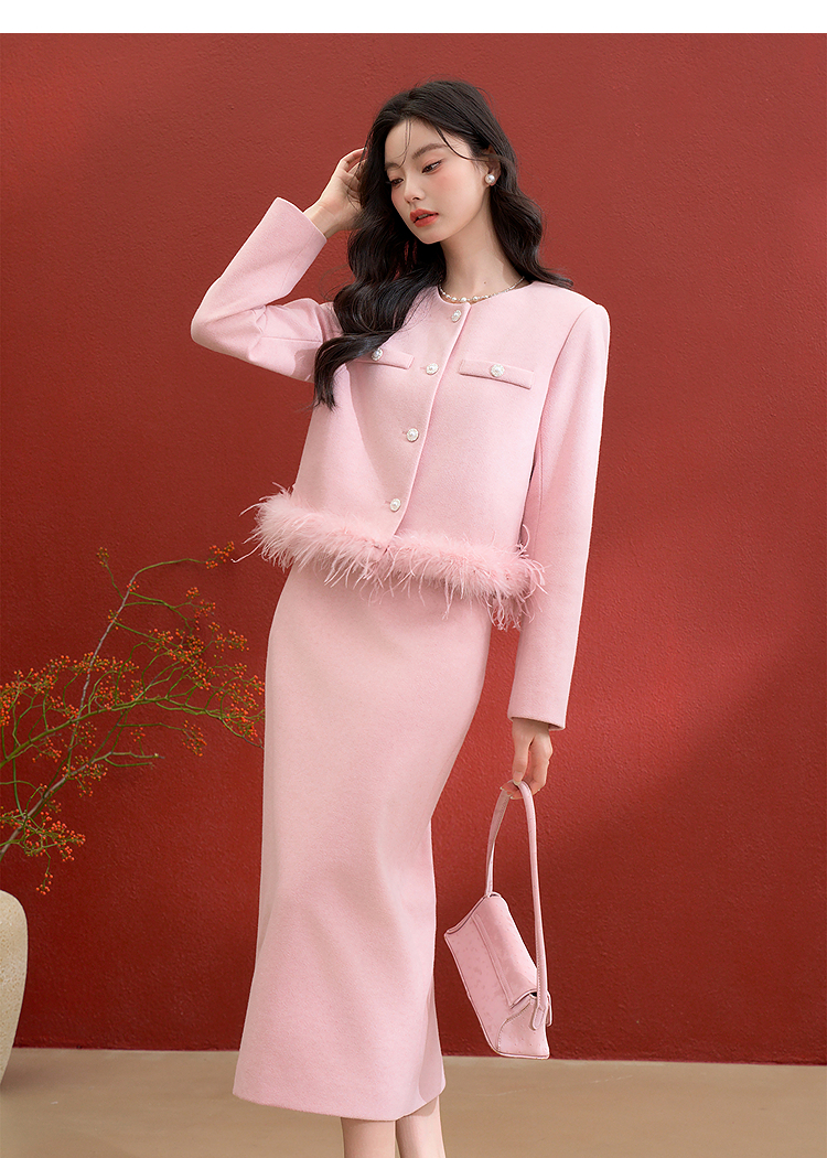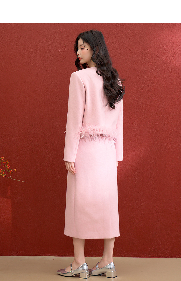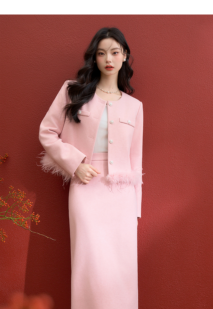 西遇珍珠扣粉色小香风套装女冬季羽毛边毛呢上衣搭直筒半身裙V3955361