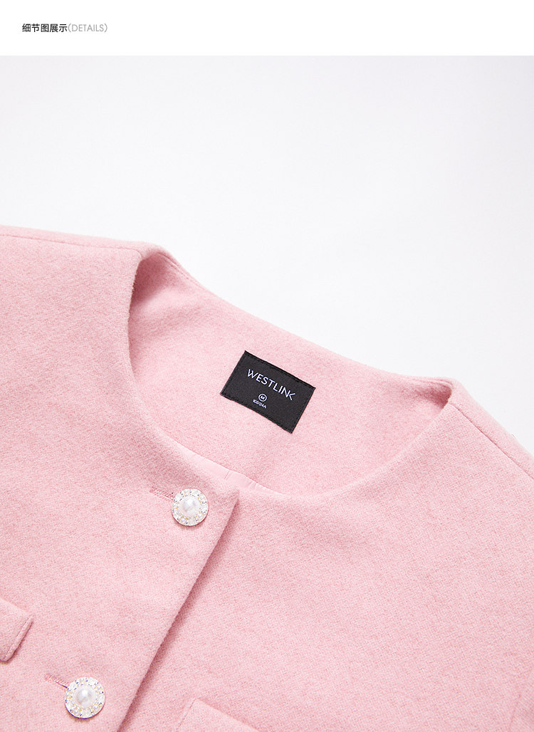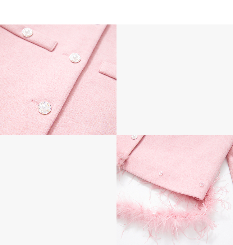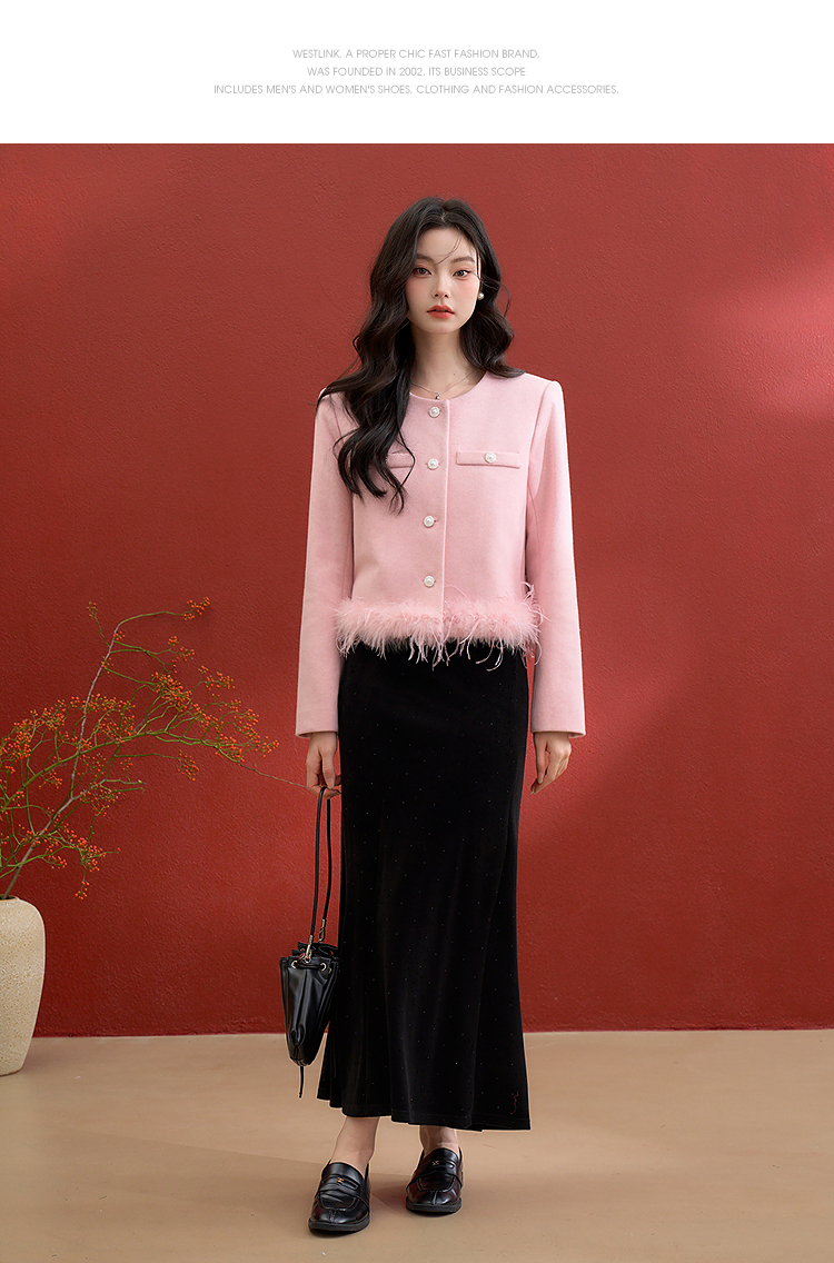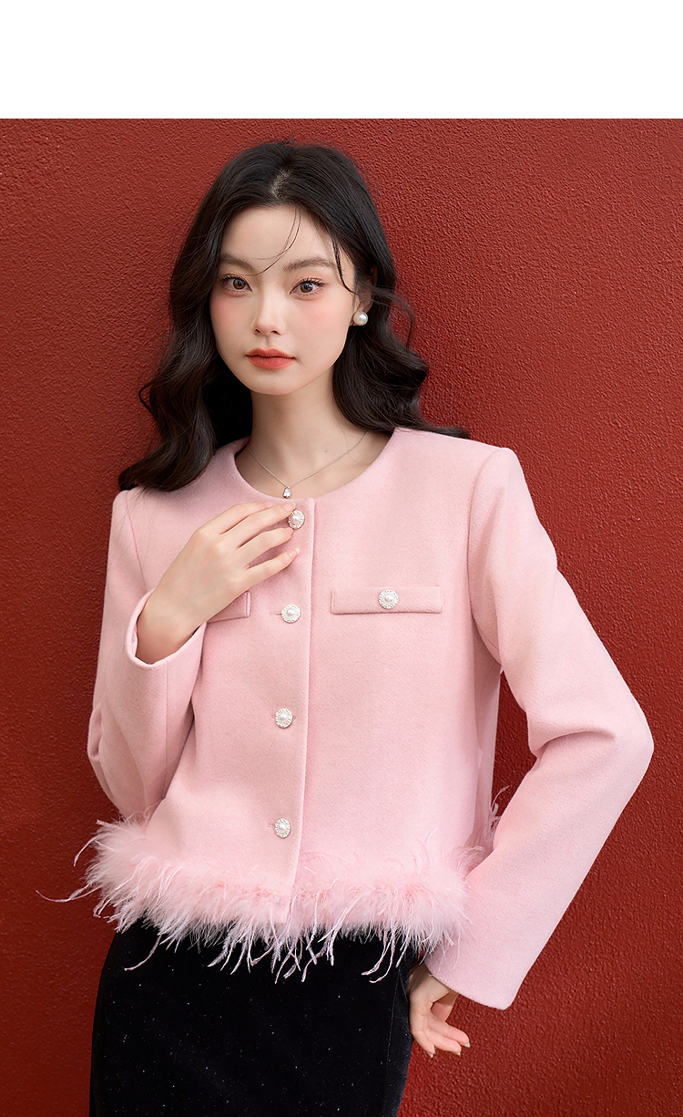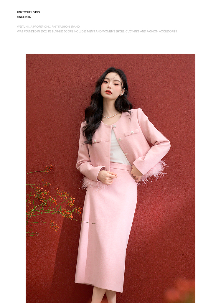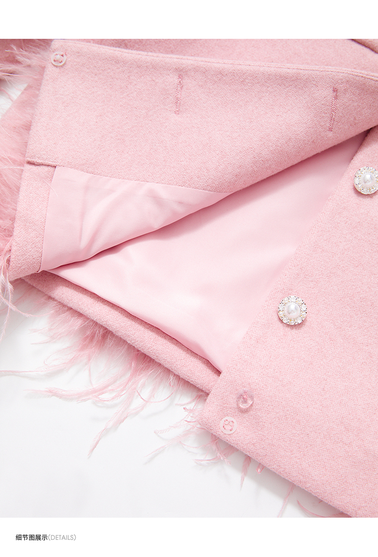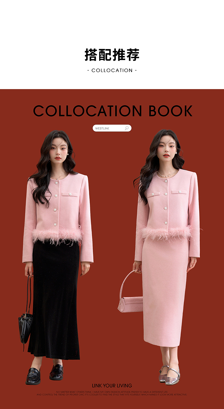 西遇珍珠扣粉色小香风套装女冬季羽毛边毛呢上衣搭直筒半身裙V3955361