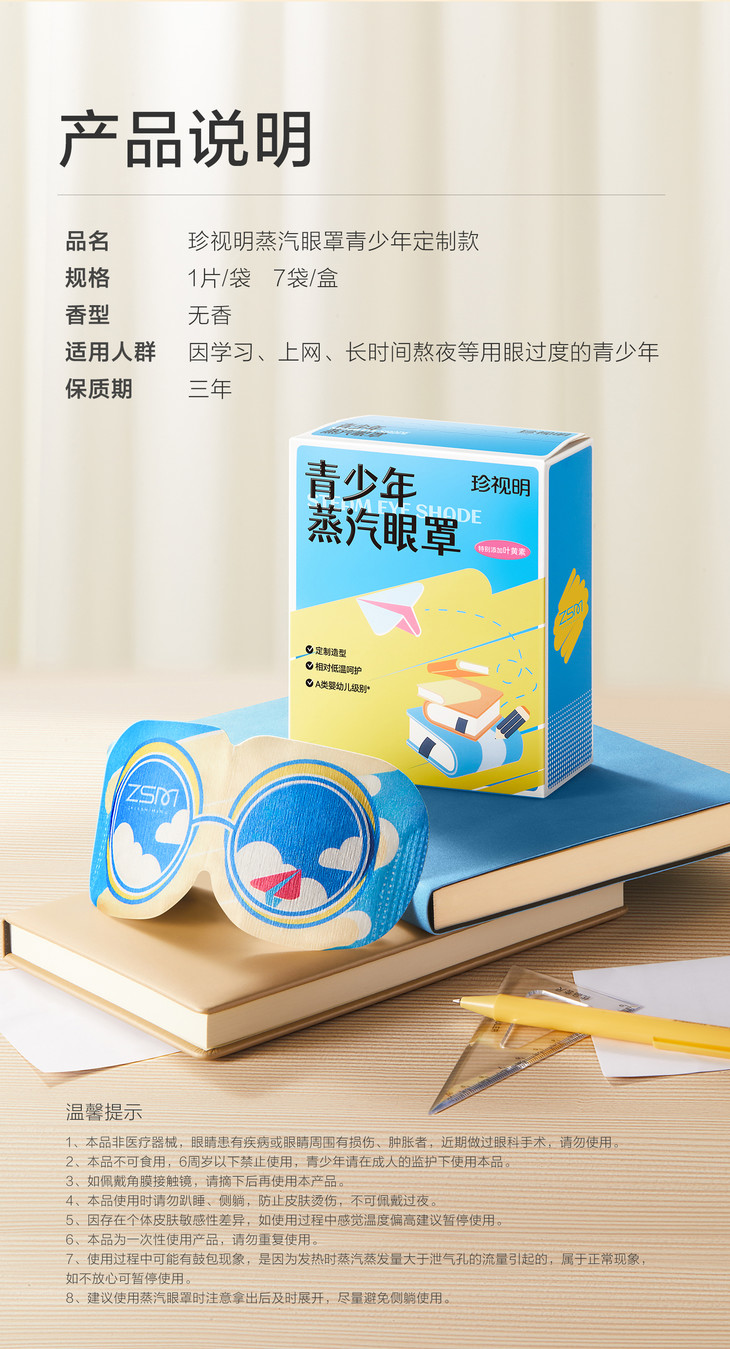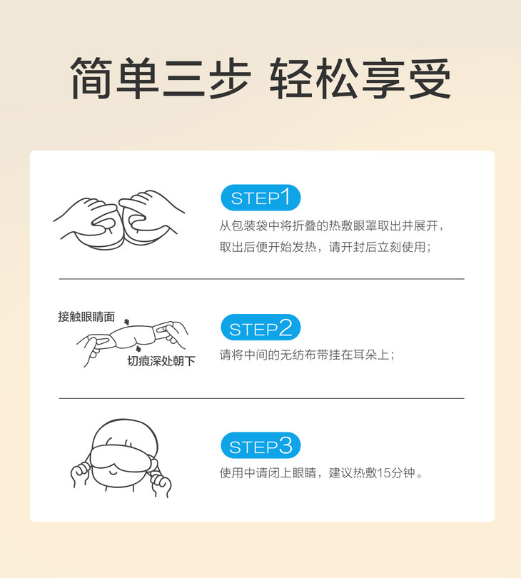 8、建议使用蒸汽眼罩时注意拿出后及时展开,尽量避免侧躺使用。
