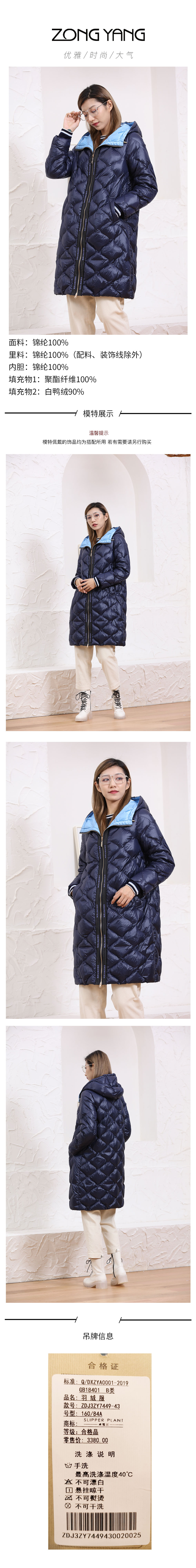 宗洋&卓蔻兰 女士长款休闲时尚款羽绒服ZDJ3ZY7449-43