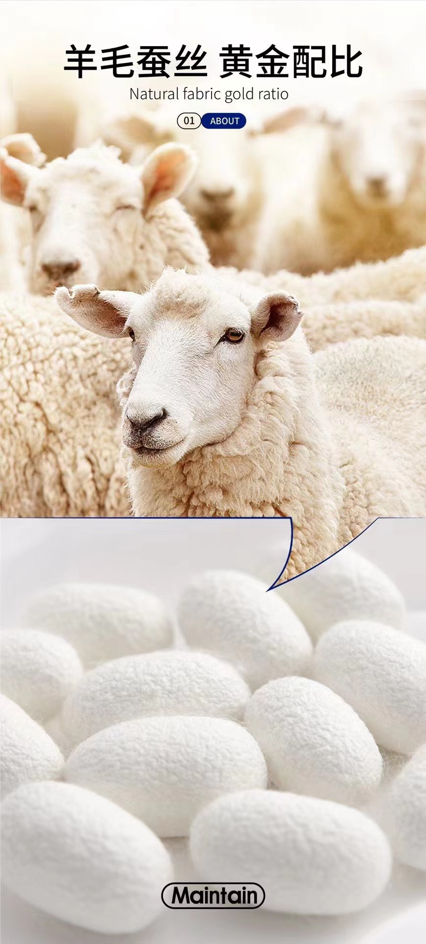 至尊绵羊毛与桑蚕丝通过科学配比混纺,绵羊毛轻柔舒肤,极速聚暖,有“织物软黄金”的美誉,桑蚕丝被称为”纤维皇后”具有天然调温功能,爽而不温,润而不燥!