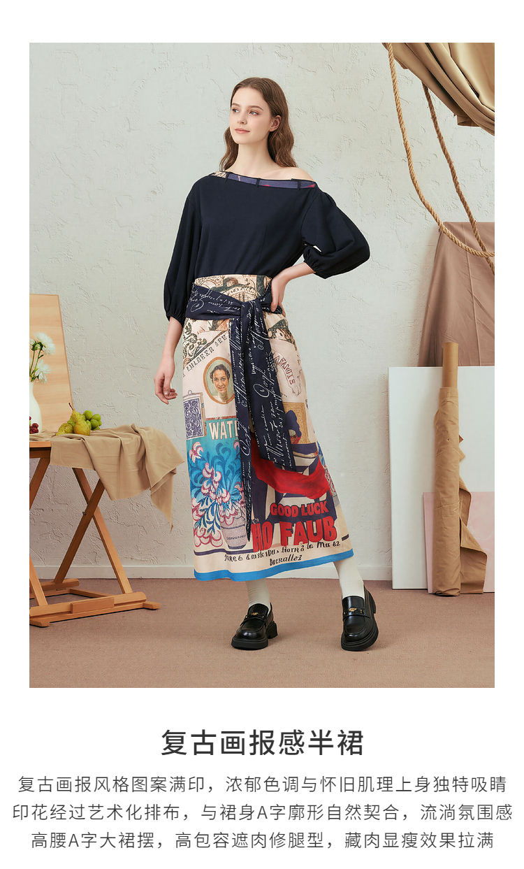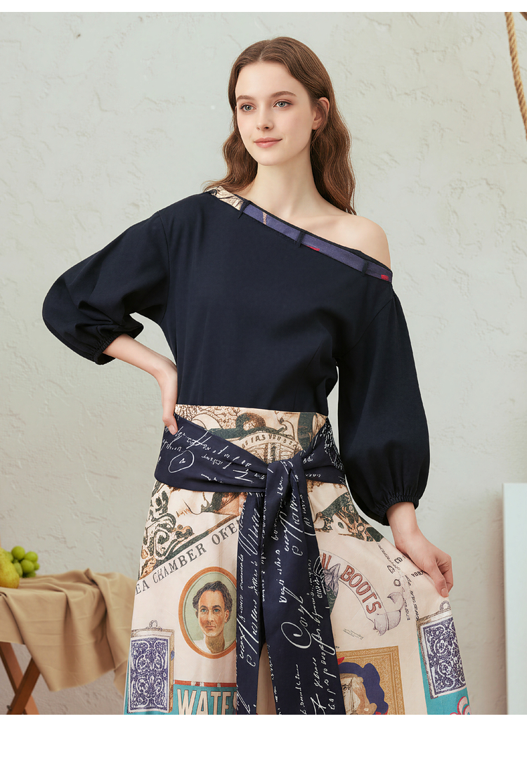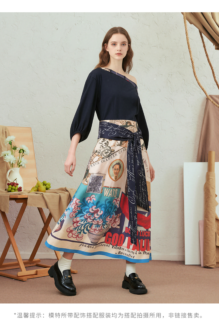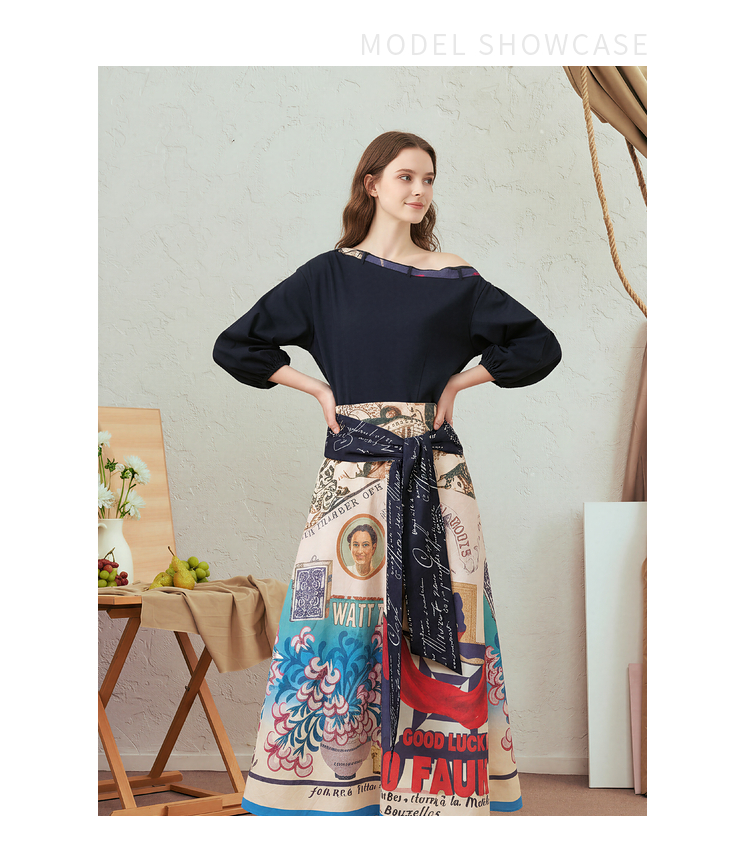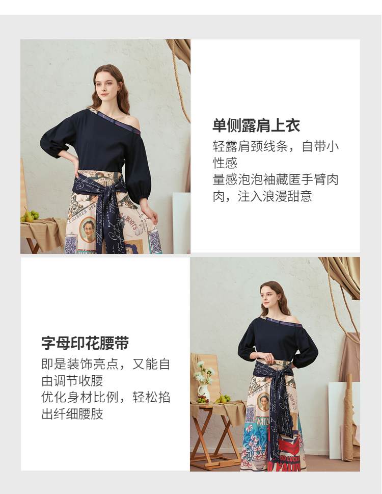 两三事画报女郎2026春季新款优雅绑带印花裙摆不对称一字肩连衣裙