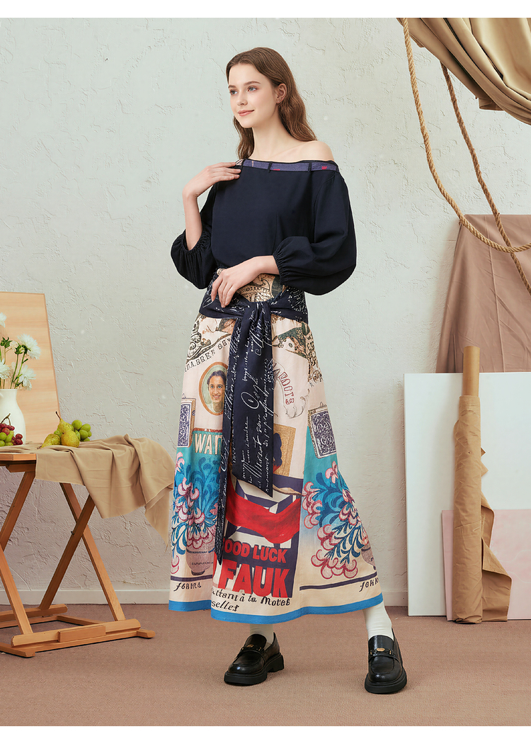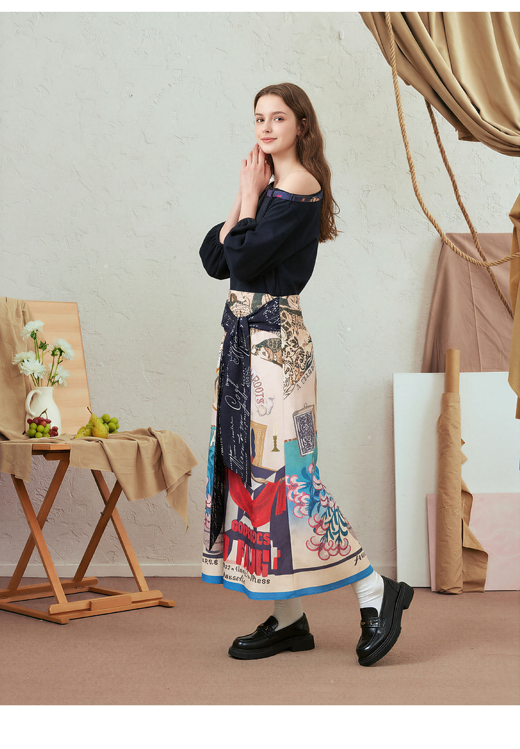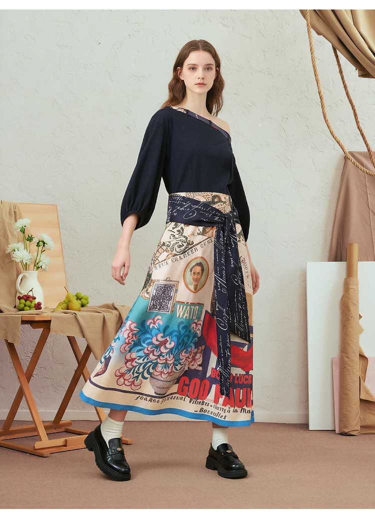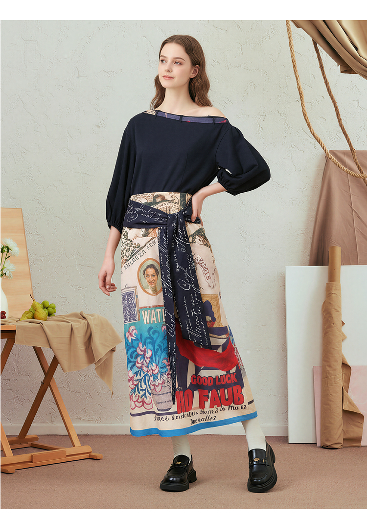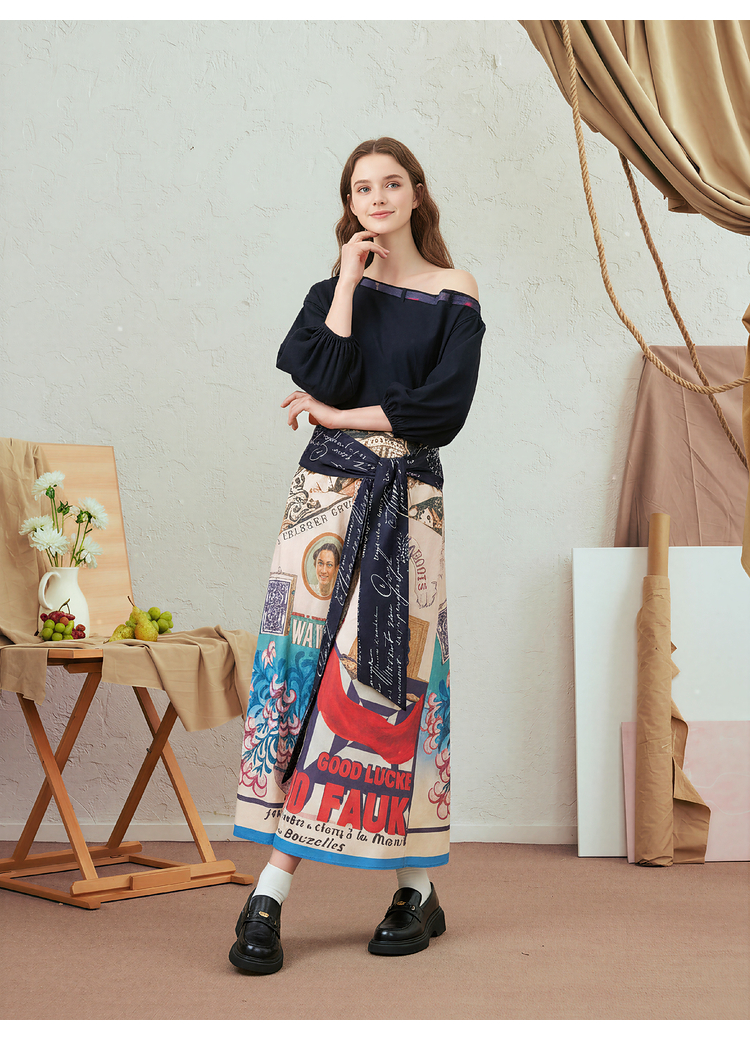 两三事画报女郎2026春季新款优雅绑带印花裙摆不对称一字肩连衣裙