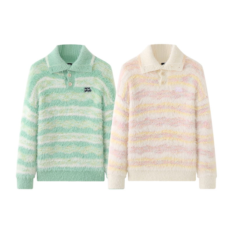 YKYB宽松毛衣冬季保暖多巴胺上衣时尚潮流休闲polo领条纹针织衫