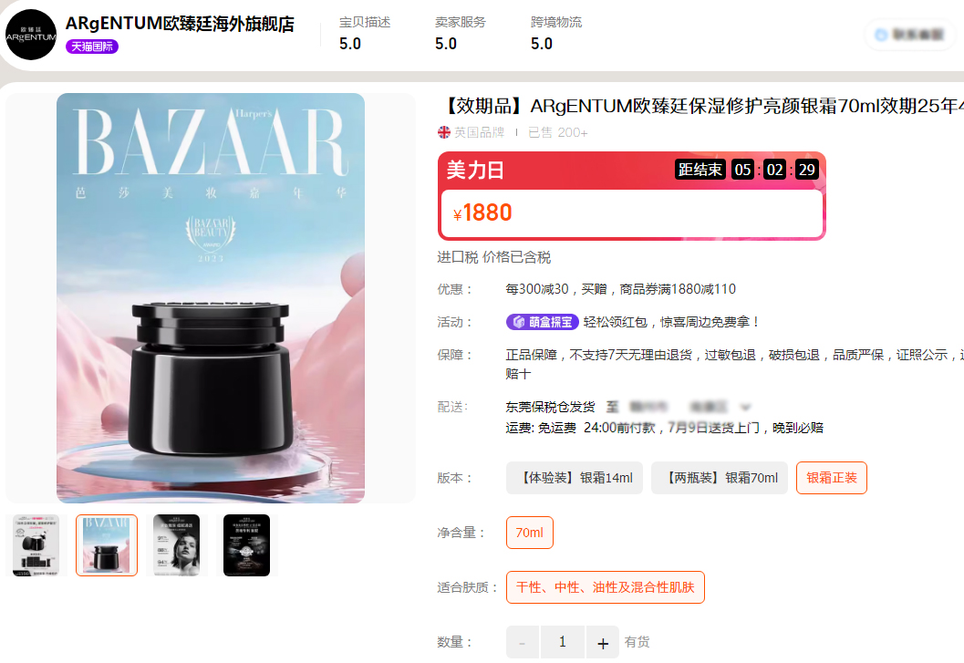 【品名】Argentum欧臻廷保湿修复臻颜银霜14ml