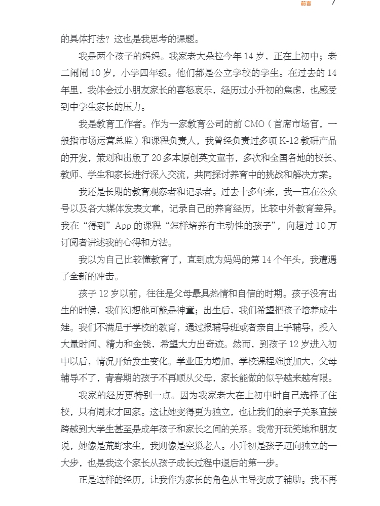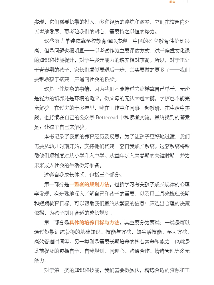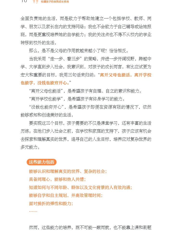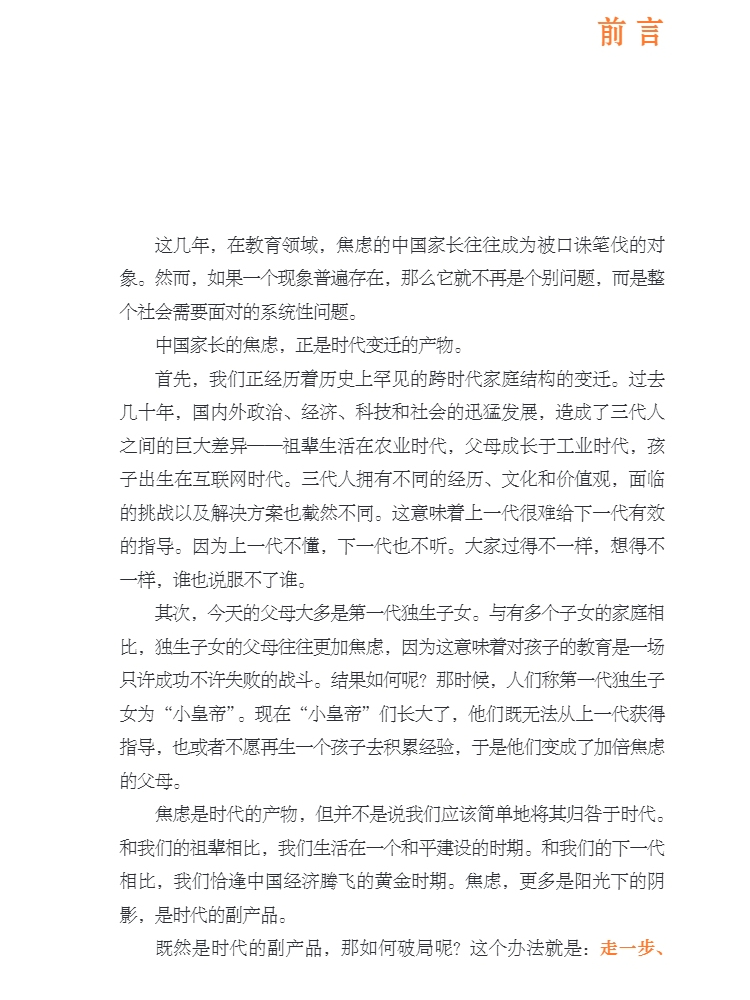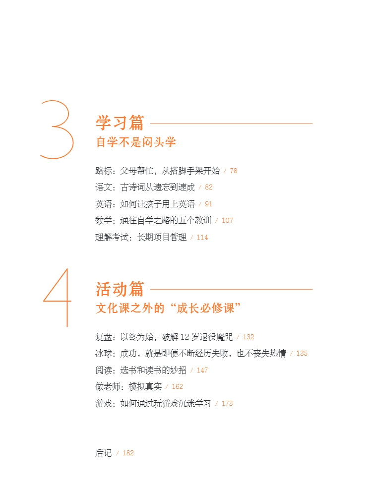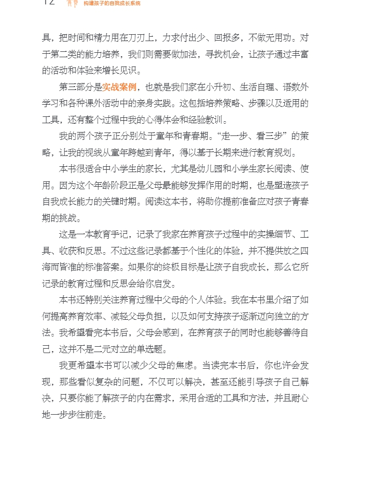 书中围绕“父母的四种武器”“走一步、看三步”“靠同伴撬动孩子兴趣”等核心理念,从教育规划、生活技能、社会活动到自主学习层层拆解,为家长提供了从“主导者”转型到“支持者”的完整方案。