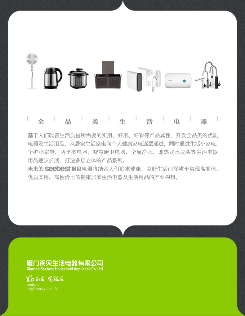厦门视贝科技有限公司是集产品自主设计,研发,生产,销售于一体的高科技企业。拥有80000平方米的制造厂房,核心员工2000多人。产品线涵盖照明、电工,卫浴,线路,集成风暖等领域。