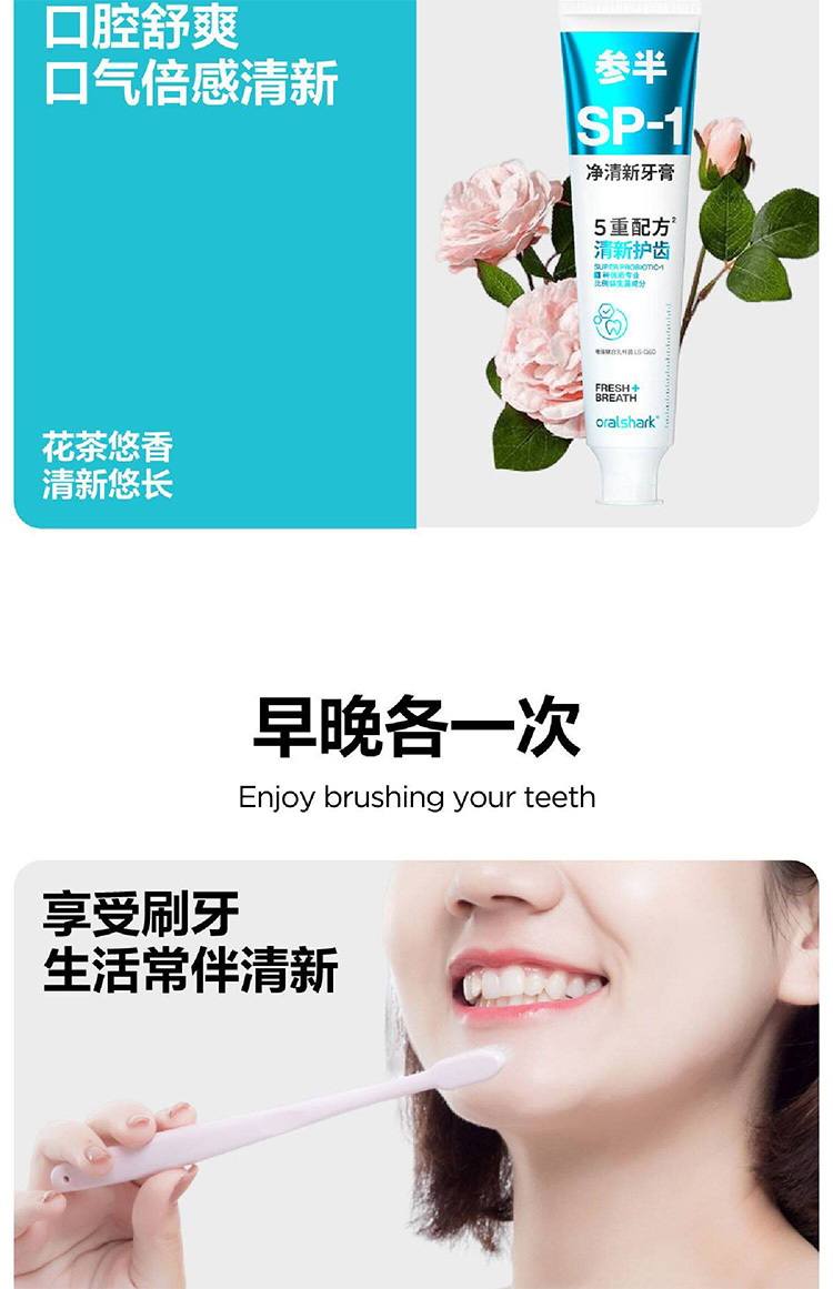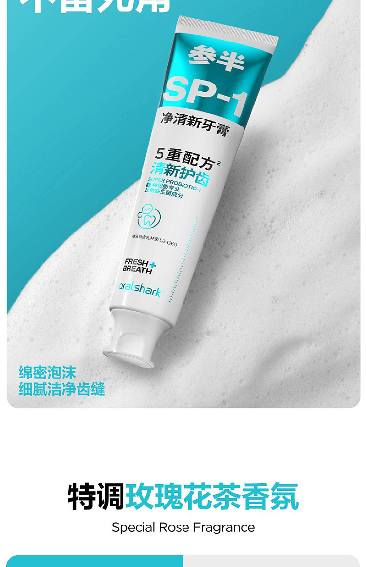 参半oralshark净清新牙膏玫瑰清茶味180g