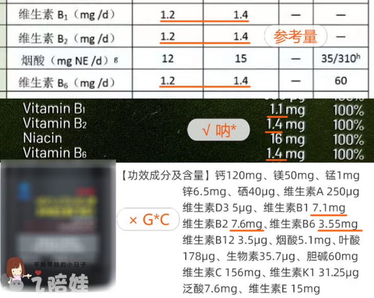 用这张表,去比对商品的营养成分表,尽量选吃一粒就营养很全乎的。