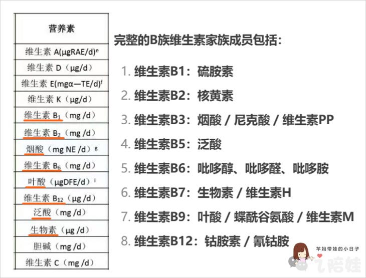 那咱们先看B族维生素都有谁?这得把学名和维生素编号结合起来看。