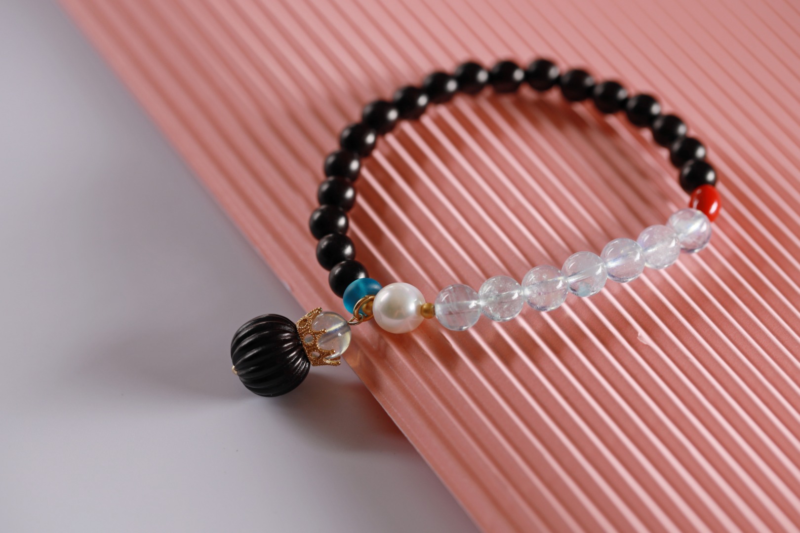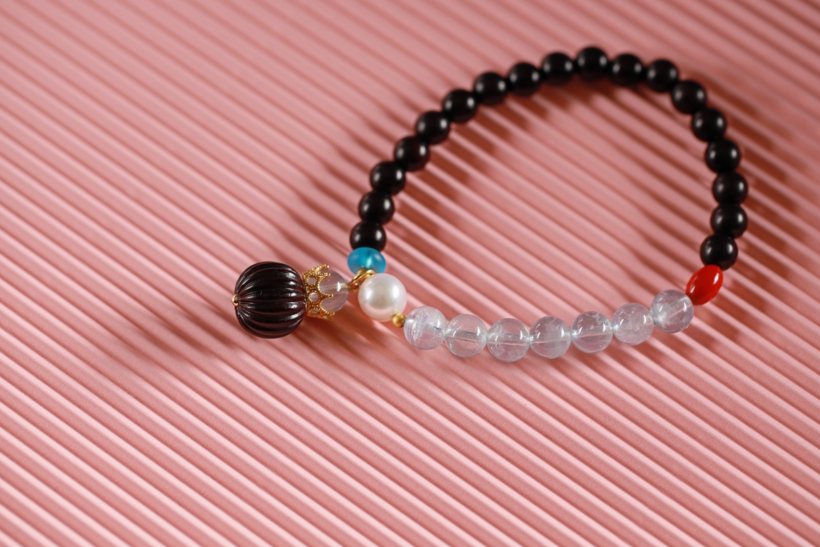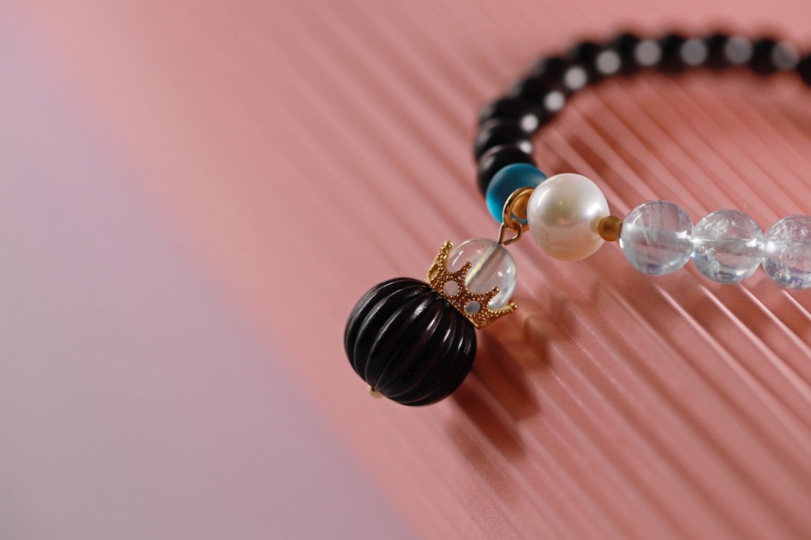 颗颗精选印度小叶紫檀,中间搭配的是淡水无核珍珠光泽感十足,其次便是渐变的海蓝宝