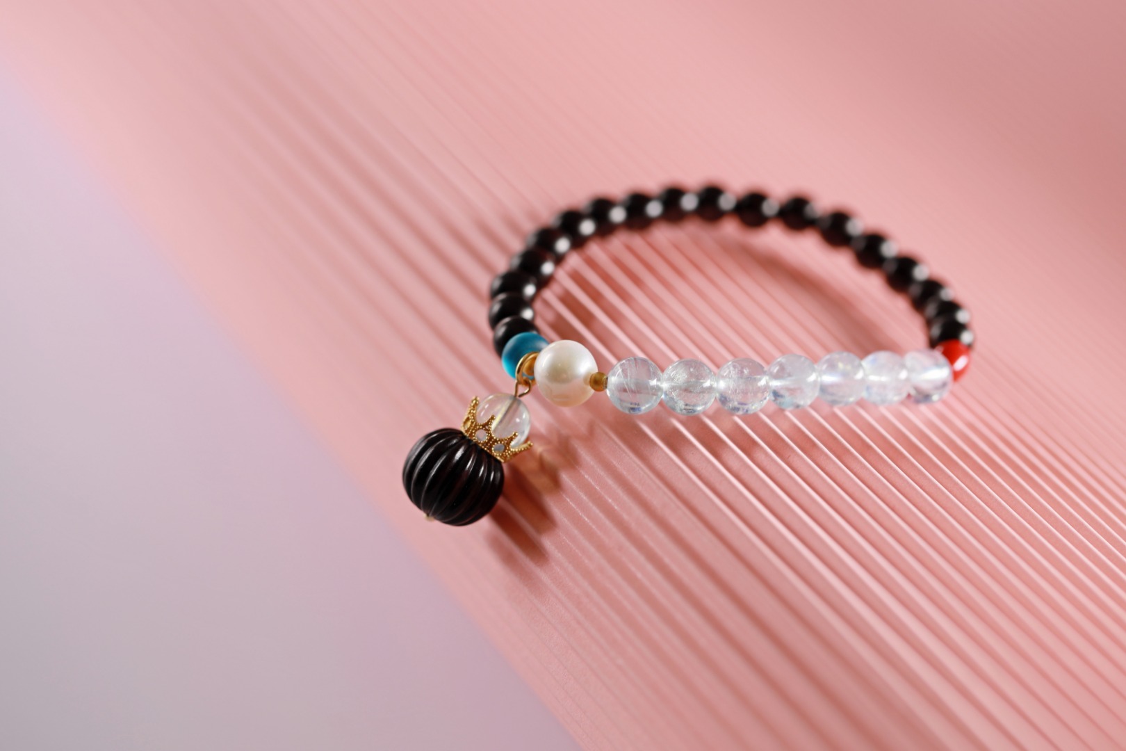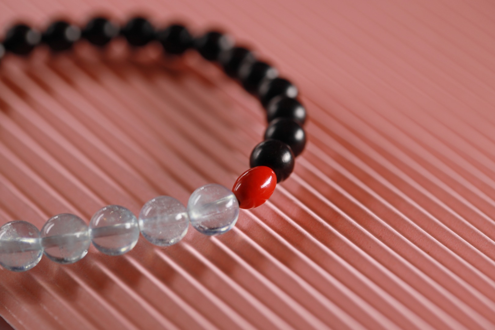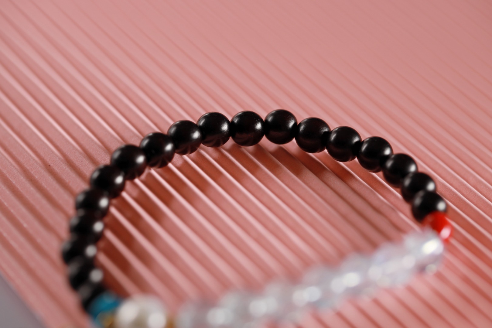 颗颗精选印度小叶紫檀,中间搭配的是淡水无核珍珠光泽感十足,其次便是渐变的海蓝宝