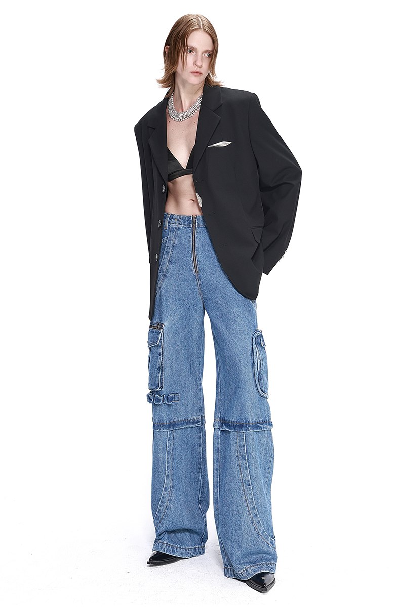 NUTH 立体抓褶设计水洗做旧宽松直筒阔腿牛仔裤