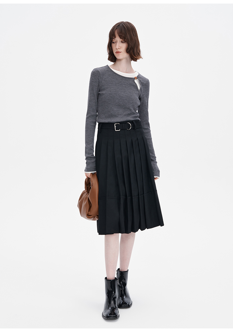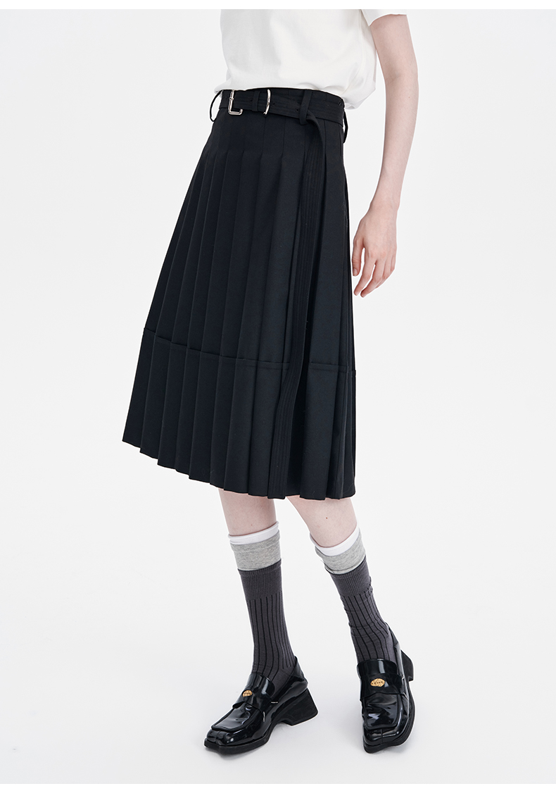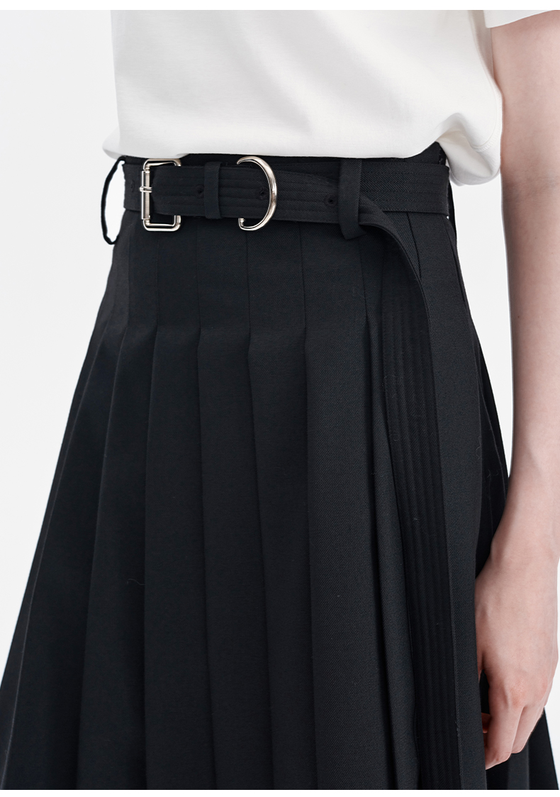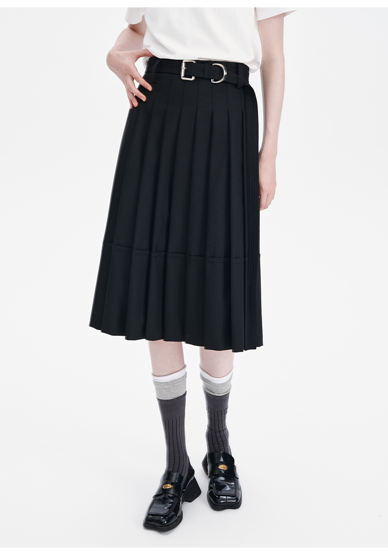 SELFWHO羊毛混纺黑色a字百褶半身裙女2024秋季新款小个子高腰半裙