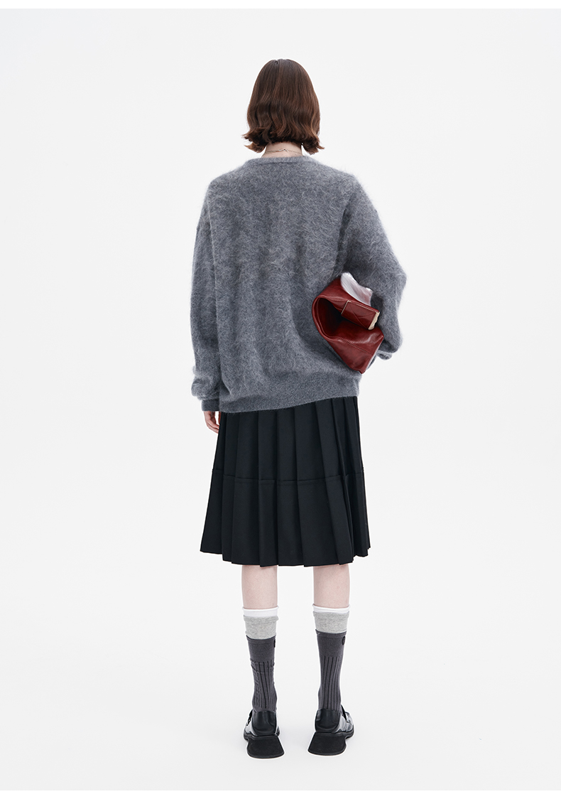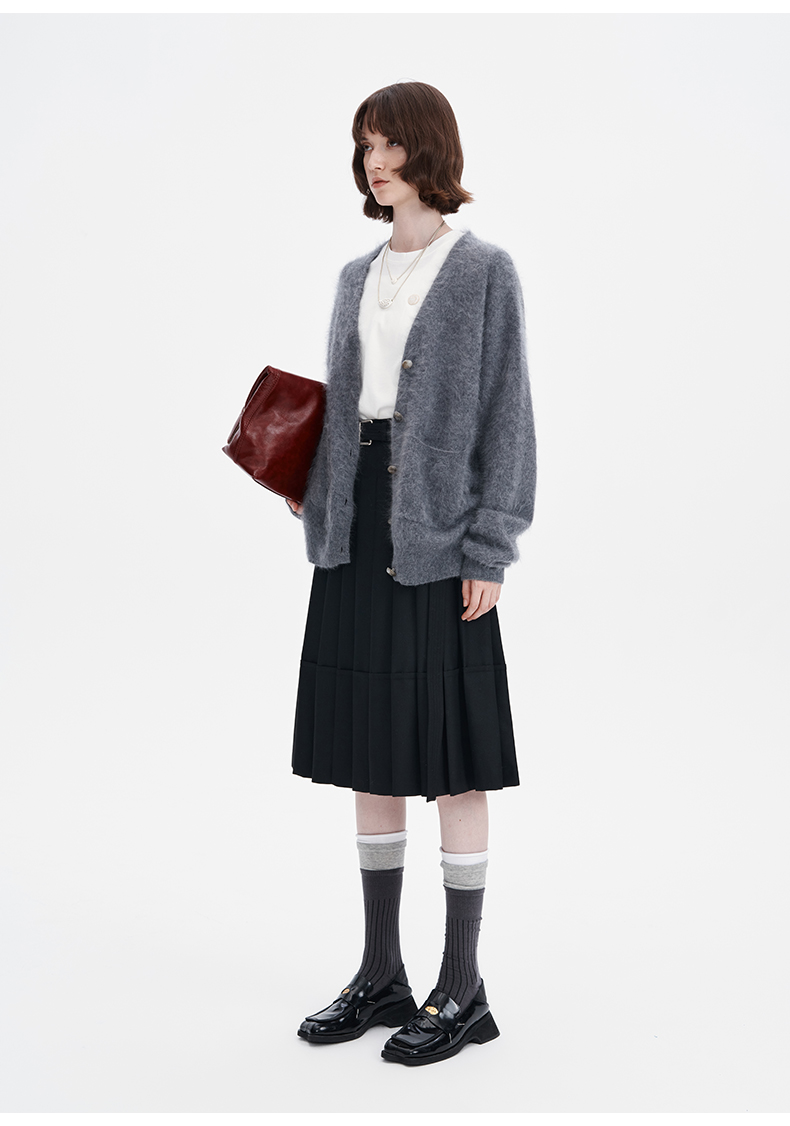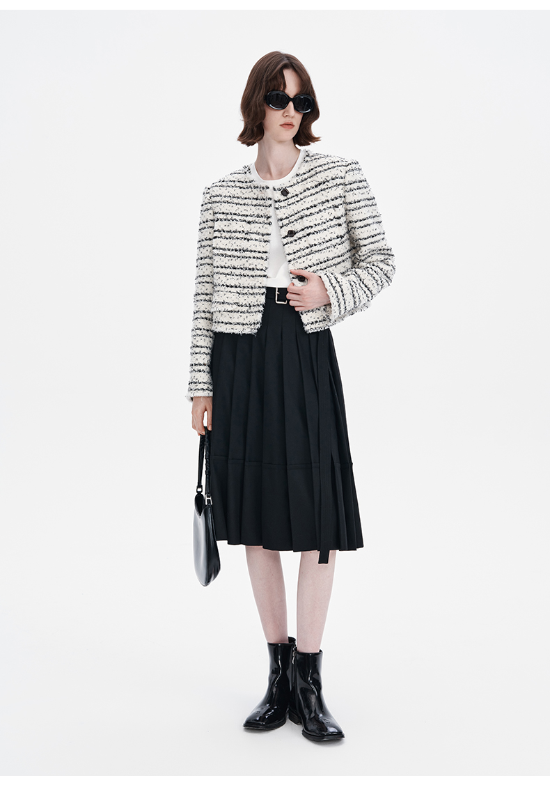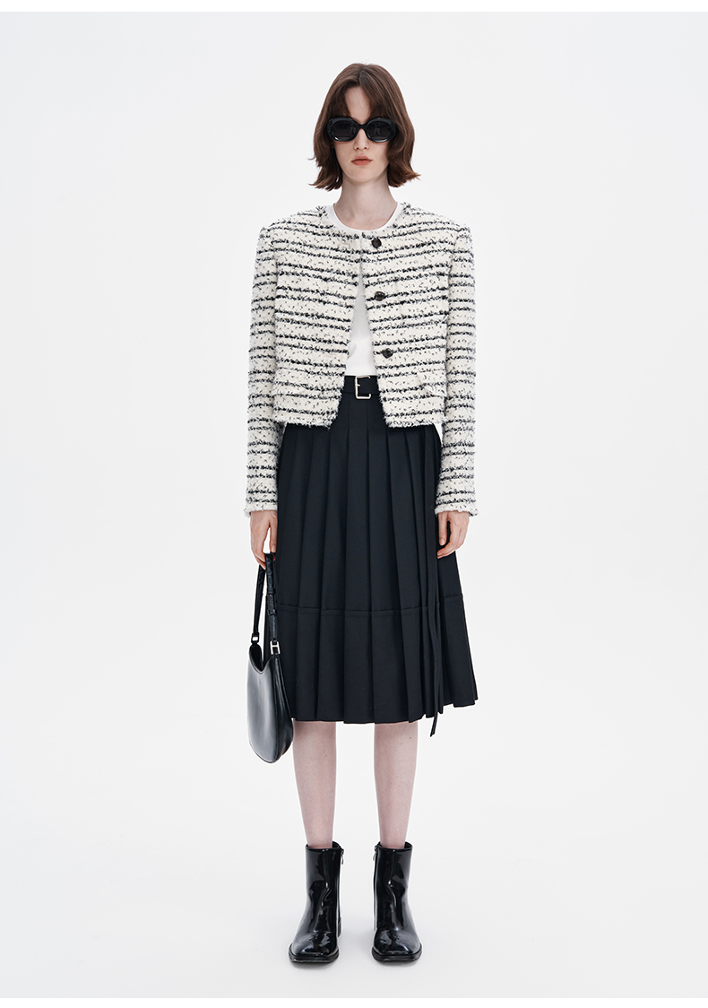 SELFWHO羊毛混纺黑色a字百褶半身裙女2024秋季新款小个子高腰半裙