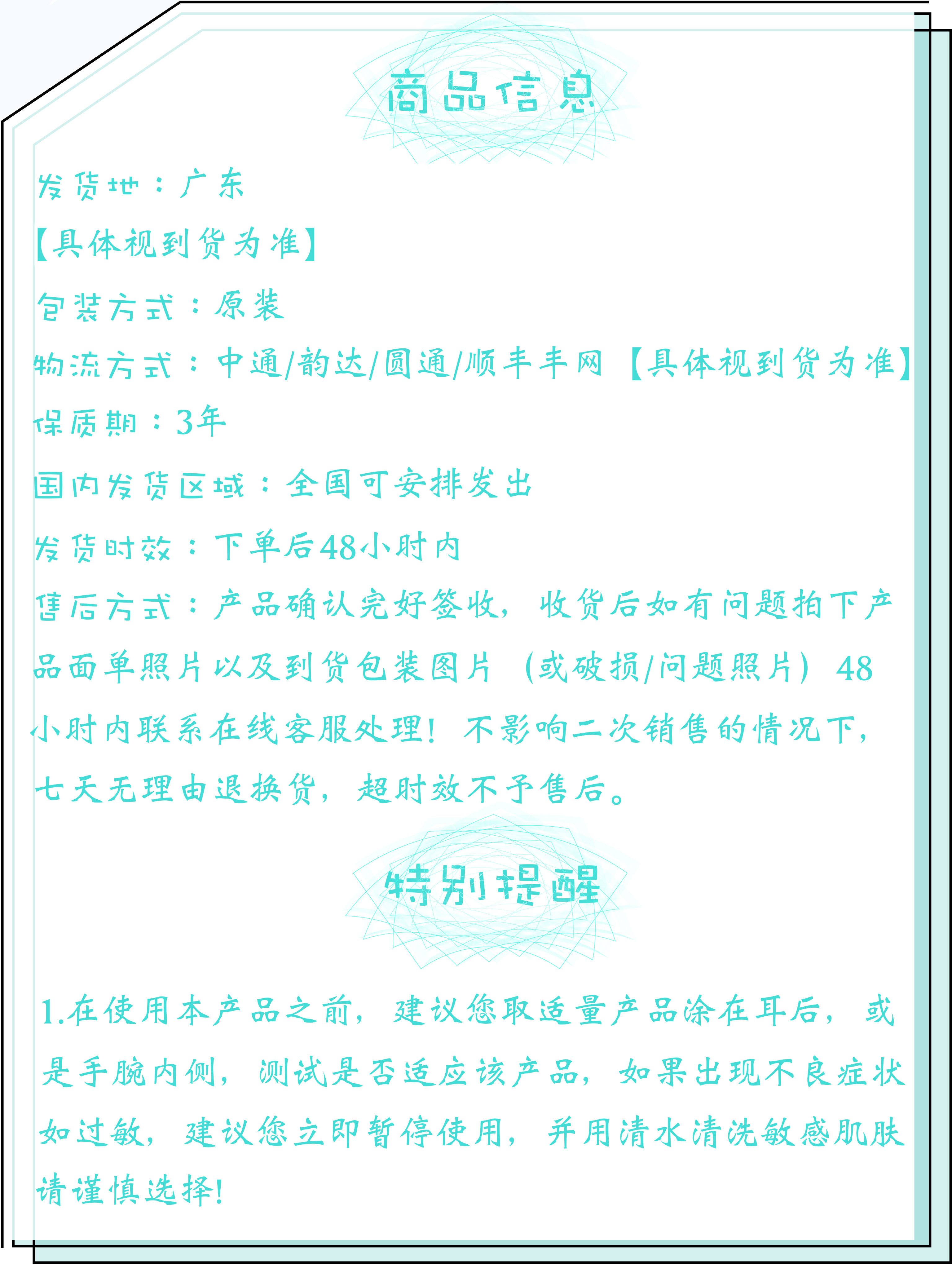【规格】:见规格明细 『規格』:見規格明細 [Specification]: See specification details 【是否有生产批号】:是 『是否有生產批號』:是 [Is there a production batch number]: Yes 【资质是否齐全】:是 『資質是否齊全』:是 [Is the qualification complete]: Yes 【产品保质期】:三年 『產品保質期』:三年 [Product shelf life]: three years 【包装方式】:盒装 『包裝管道』:盒裝 [Packaging method]: boxed 【快递】:四通一达 『快遞』:四通一達 [Express ]: Four connections and one delivery 【运费模板】:全国均发 『運費範本』:全國均發 [Freight template ]: Nationwide average shipping 【发货时效】:48小时 『發貨時效』:48小時 [Delivery time ]: 48 hours 【售后问题】:支持七天无理由退换(未拆封且配件齐全,不影响二次销售) 『售後問題』:支持七天無理由退換(未拆封且配件齊全,不影響二次銷售) [After sales issues]:Support for seven days of no reason return and exchange (unopened and complete accessories, not affecting secondary sales) |