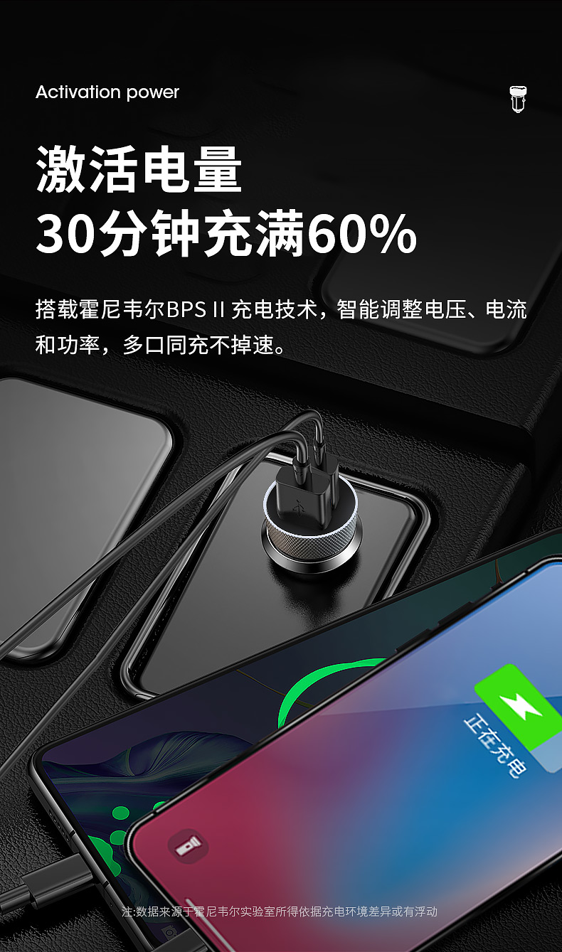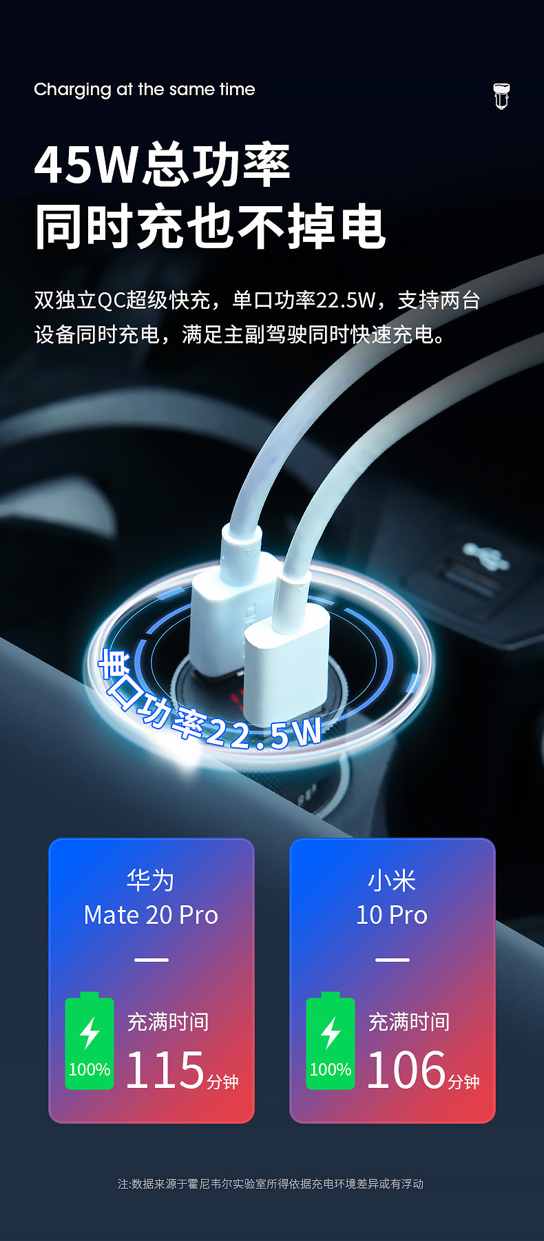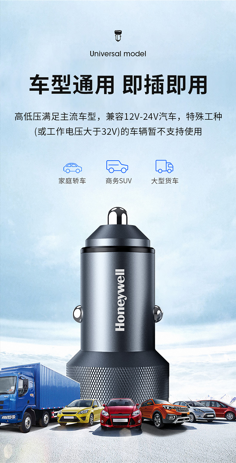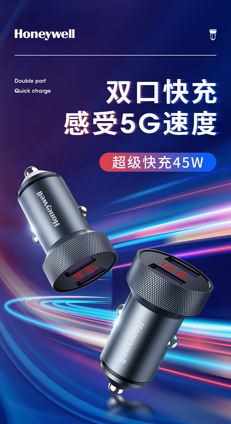 霍尼韦尔 车载充电器45W快充充电器双口USB一拖二点烟器通用苹果华为小米手机平板